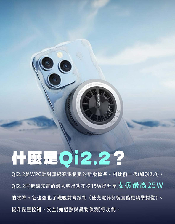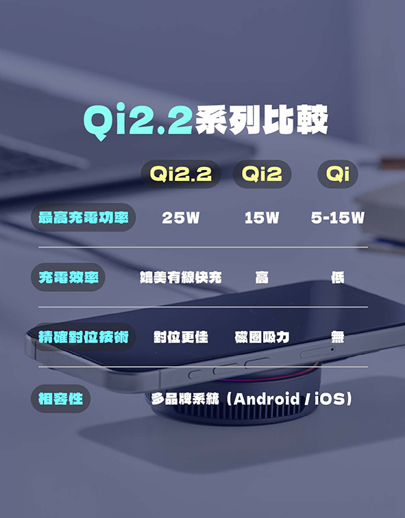 Qi2.2是WPC針對無線充電制定的新版標準。相比前一代(如Qi2.0), Qi2.2將無線充電的最大輸出功率從15W提升至支援最高25W 的水準。它也強化了磁吸對齊技術(使充電器與裝置能更精準對位)、 提升變壓控制、安全(如過熱與異物偵測)等功能。