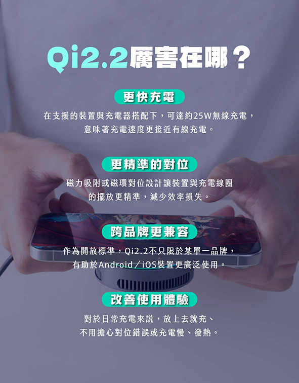 作為開放標準,Qi2.2不只限於某單一品牌, 有助於Android/iOS裝置更廣泛使用。