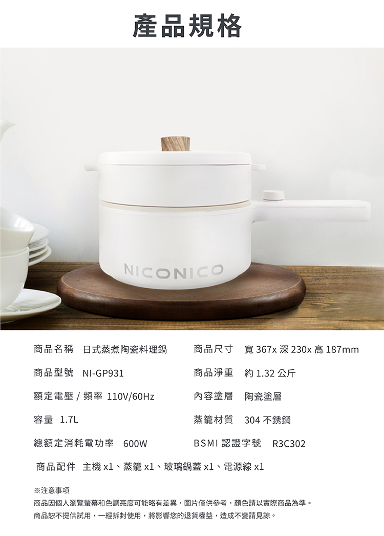 .配件:主機x1、蒸籠x1、玻璃鍋蓋x1、電源線x1、說明書x1、保固書x1