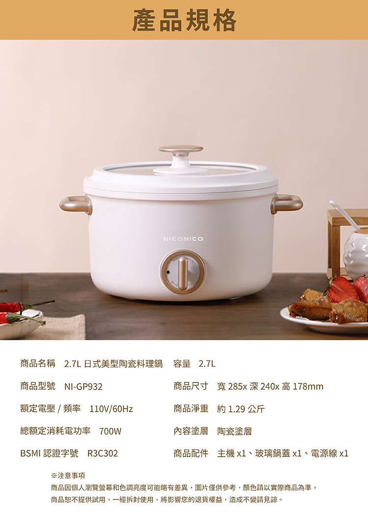 .配件:主機x1、玻璃鍋蓋x1、電源線x1、說明書x1、保固書x1