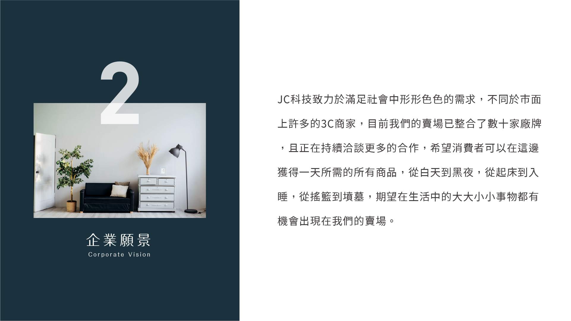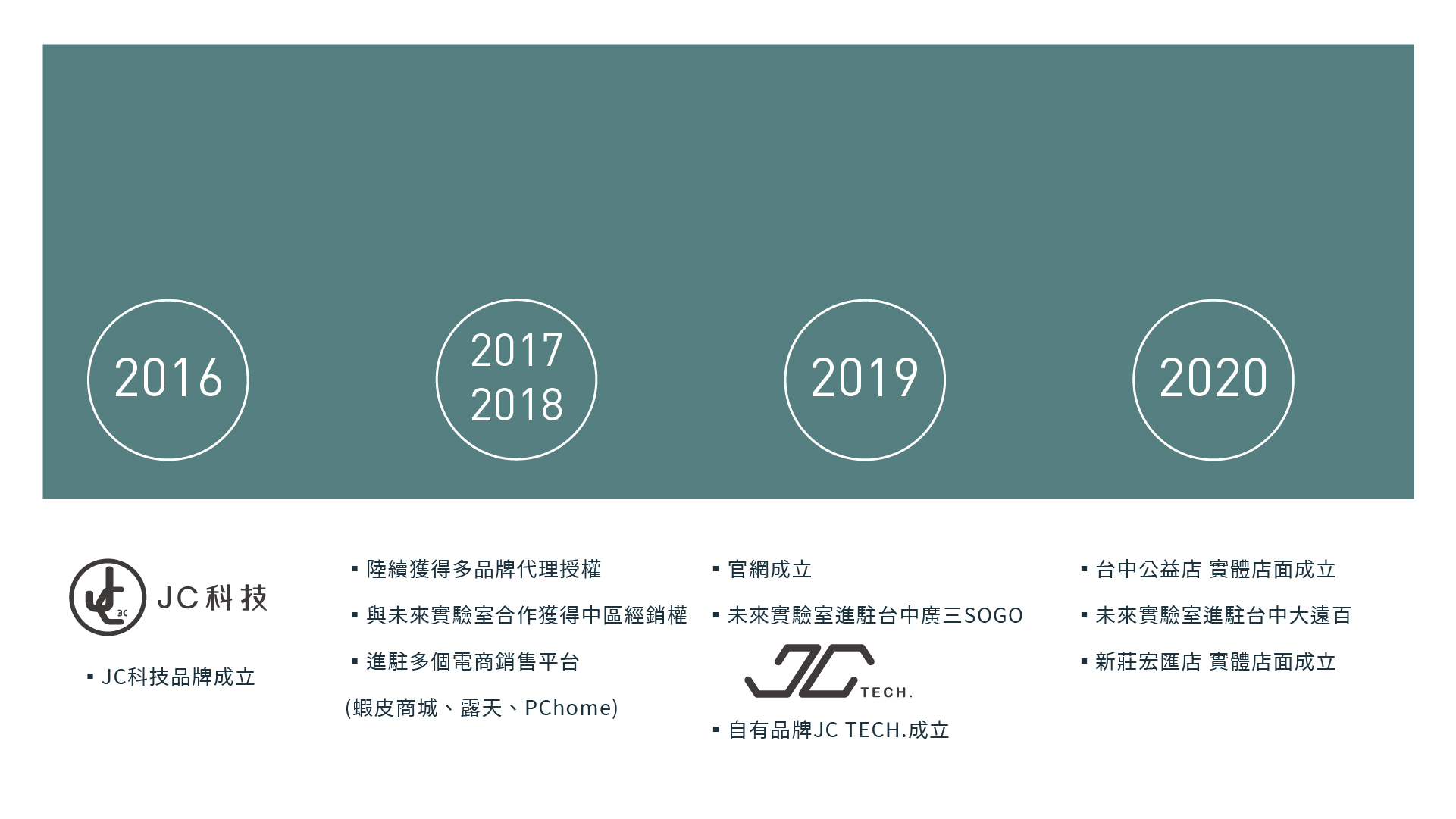 2019年創立自有品牌【JC TECH.】,包含生活科技、生物科技、3C科技及食品科技,跨足多方領域並將科技與生活結合,讓科技不再有距離感。