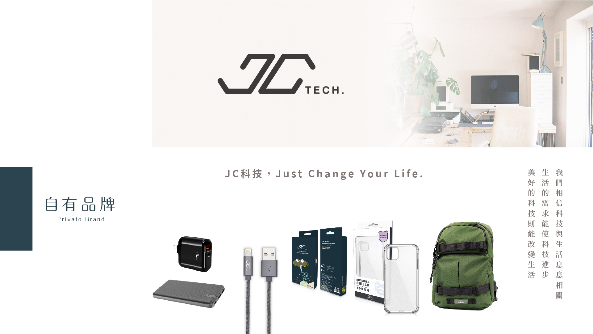 「 JUST CHANGE YOUR LIFE」為宗旨,於2019年正式成立自有品牌JC TECH.。科技包含著「生活科技」、「生物科技」、「3C科技」以及「食品科技」,我們立志將科技與生活結合,讓科技不再有距離感!