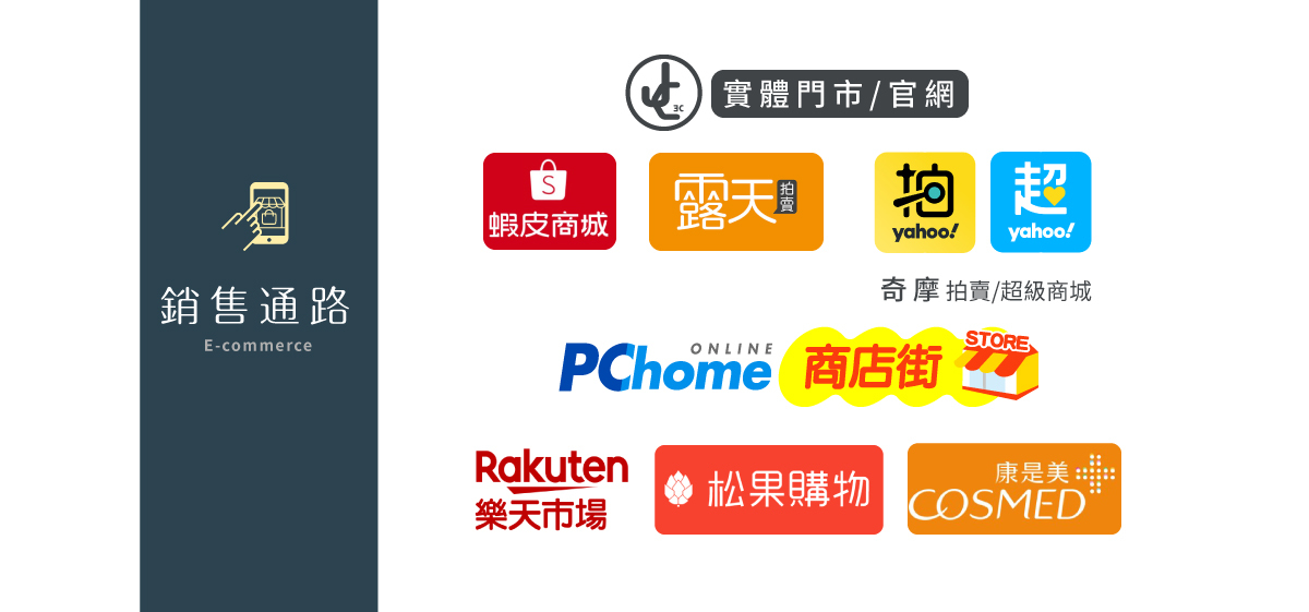 線上不僅經營自己的賣場,更有多元的販售通路如蝦皮商城、淘寶台灣、yahoo拍賣、露天拍賣、運動市集、PChome商店街、松果購物、尚青購、樂天市場。