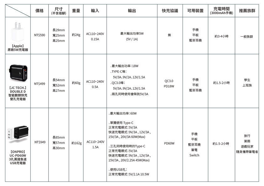 以下將分別介紹【Apple】原廠5W充電器、【JC TECH.】DOUBLE D 智能數顯快充雙孔充電器、【ONPRO】UC-PD60W 3孔萬國急速USB充電器這三款,快來看看自己適合用哪一種吧!