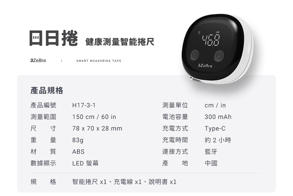 規 格 智能捲尺 x1、充電線 x1、說明書