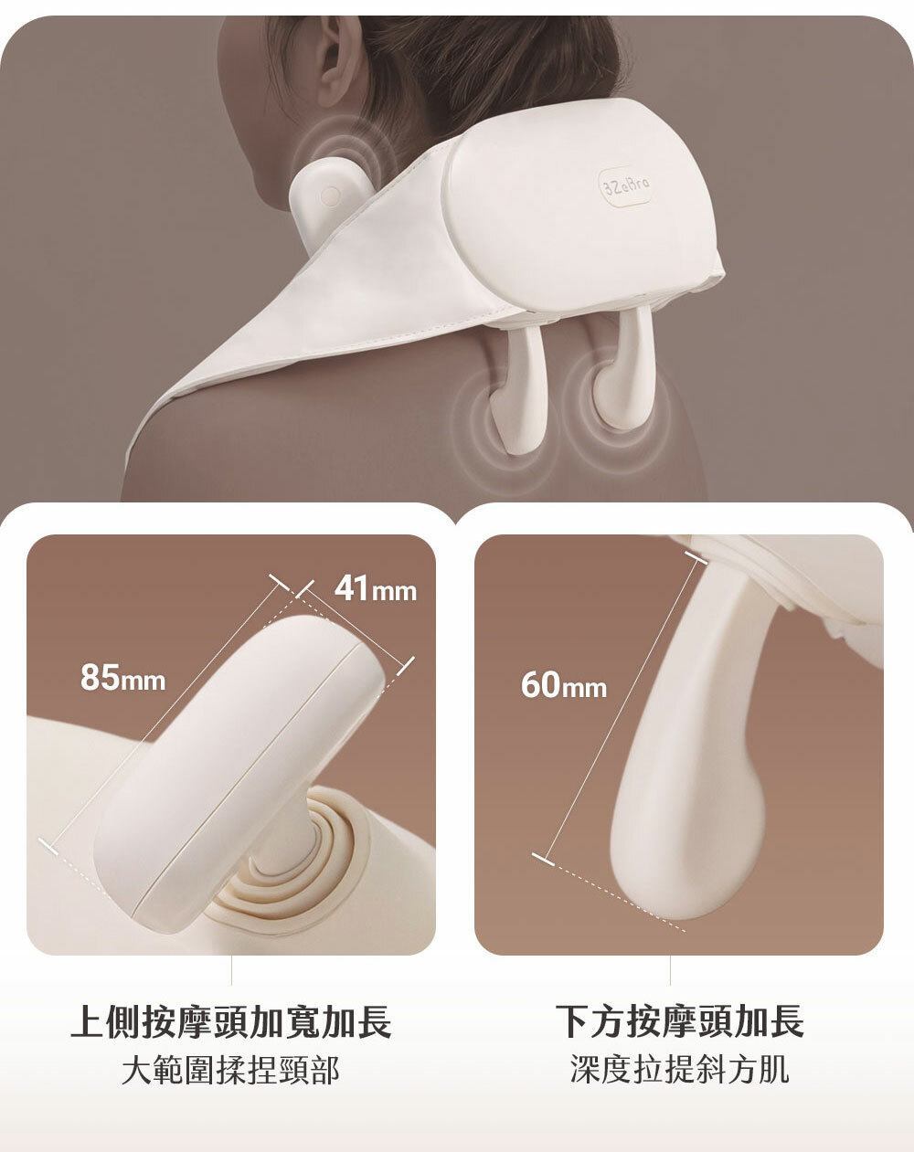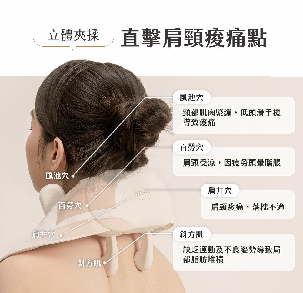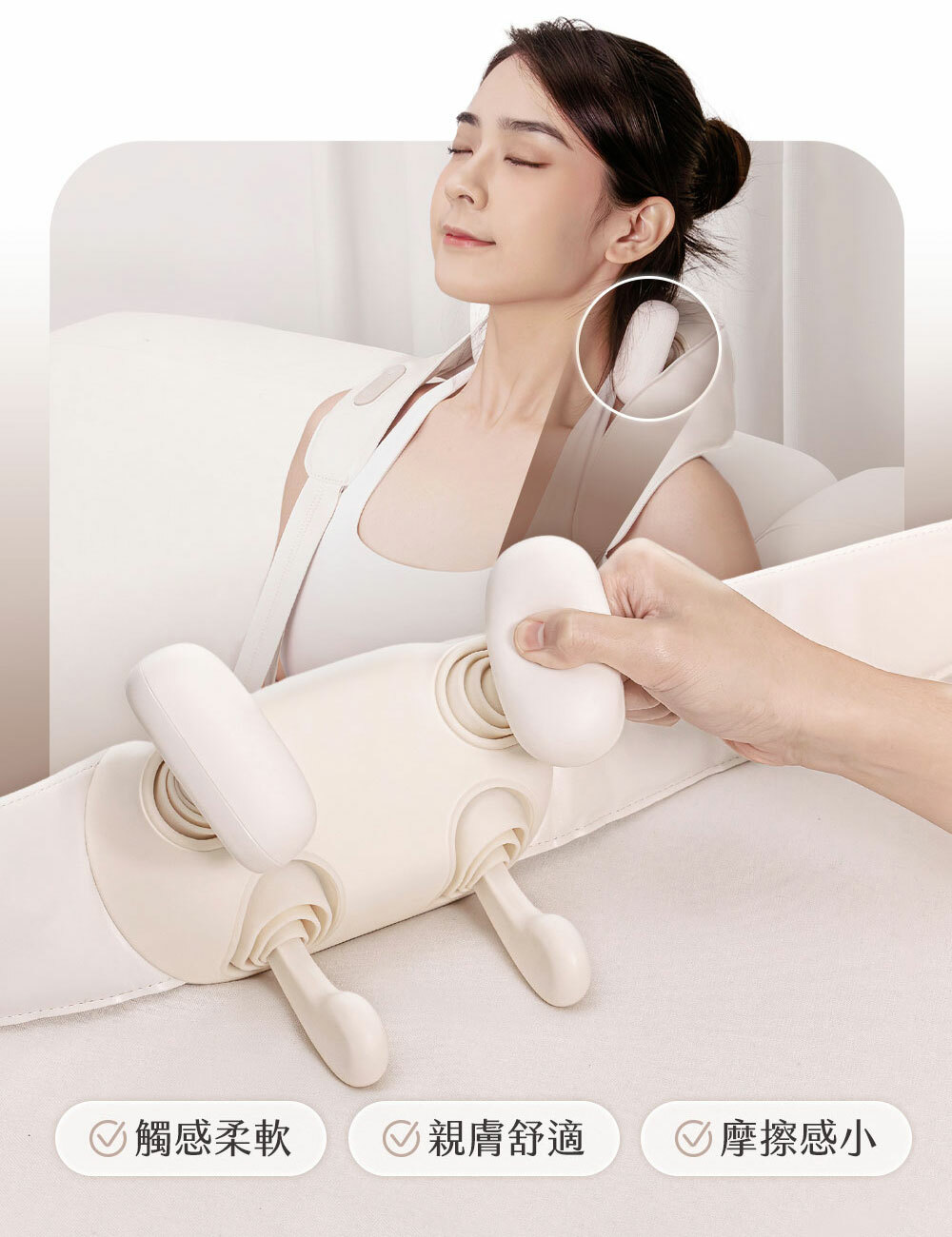 這款肩頸按摩器搭載親膚矽膠按摩頭,溫和舒適,適合敏弱肌使用。擬真人立體夾揉技術,能夠深層按壓斜方肌按摩器般的放鬆體驗,精準直擊痠痛點。同時,內建NTC智能控溫熱敷功能,透過恆溫熱敷促進循環,帶來更深入的舒緩效果。