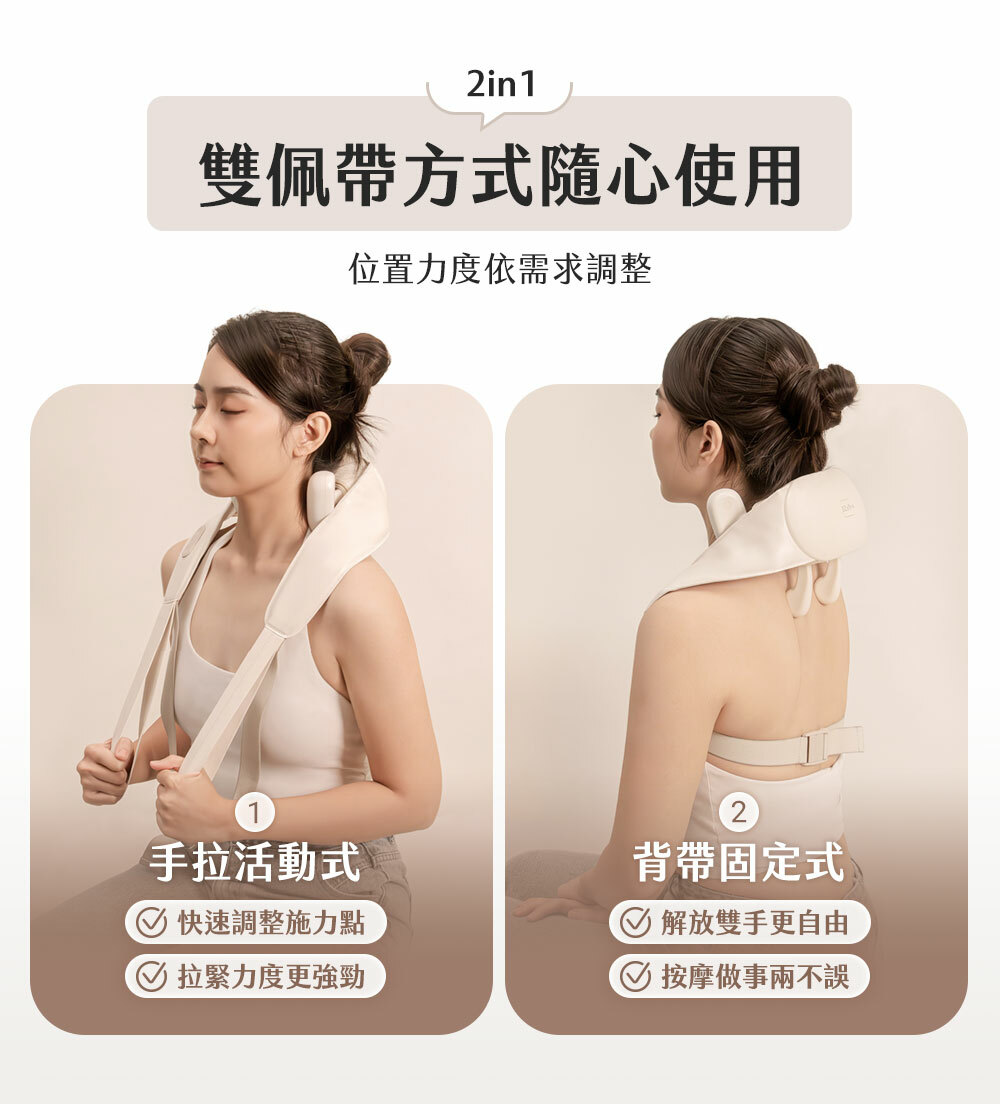 創新的雙穿戴設計,可自由選擇手持或使用背帶固定,真正解放雙手。矽膠材質易於清潔,全家人都能安心共用。不僅是肩膀按摩器,還可用於背部、腰部等多部位按摩,讓放鬆變得更全面!