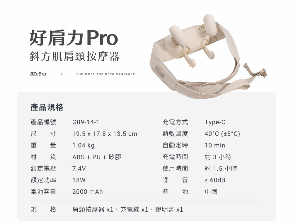 規 格 肩頸按摩器 x1、充電線 x1、說明書