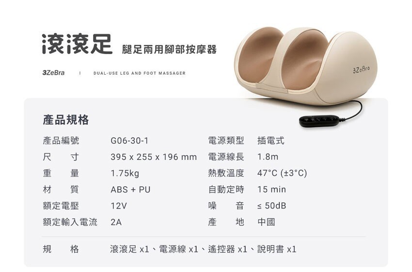 規 格 滾滾足x1、電源線x1、遙控器x1、說明書