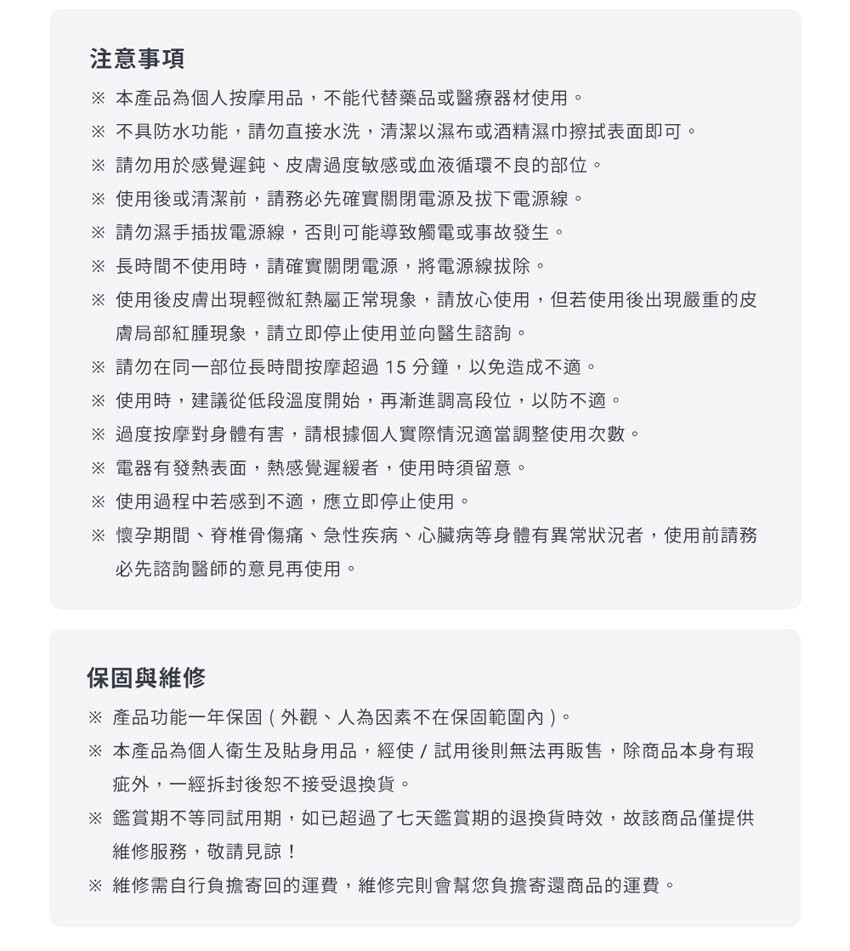 ※ 本產品為個人按摩用品,不能代替藥品或醫療器材使用。