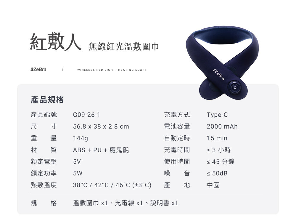 規 格 溫敷圍巾x1、充電線x1、說明書
