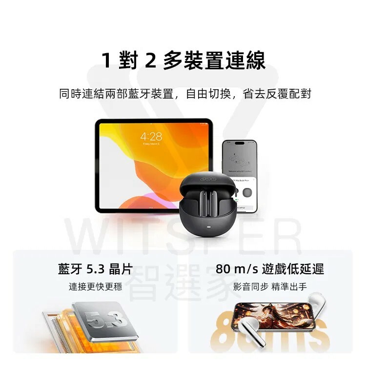 ● 藍牙 5.3 更快更穩| 採用藍牙 5.3 晶片,連線更快更穩;80 ms 低延遲遊戲模式,影音即時同步