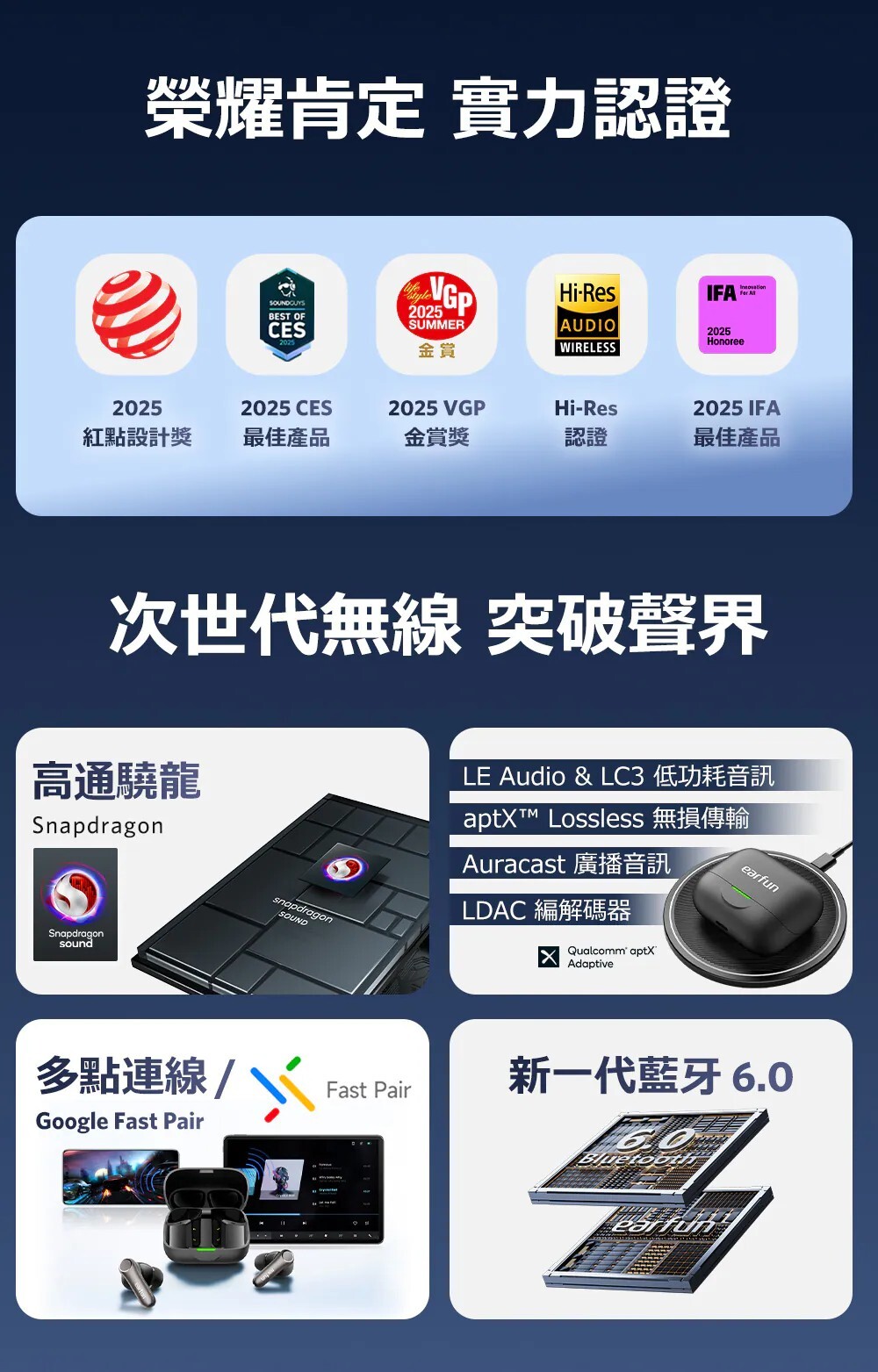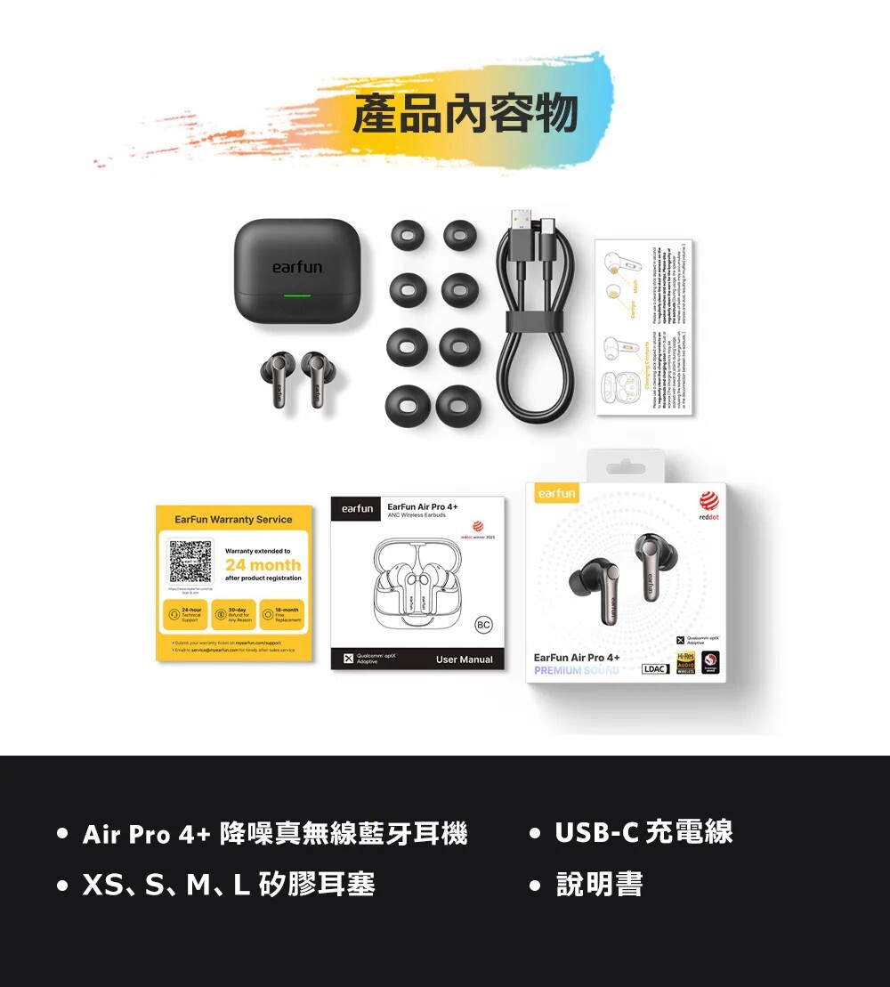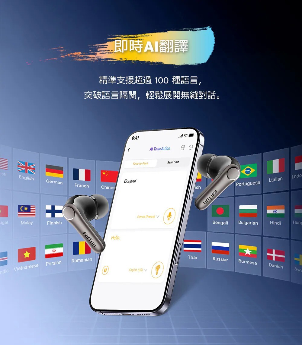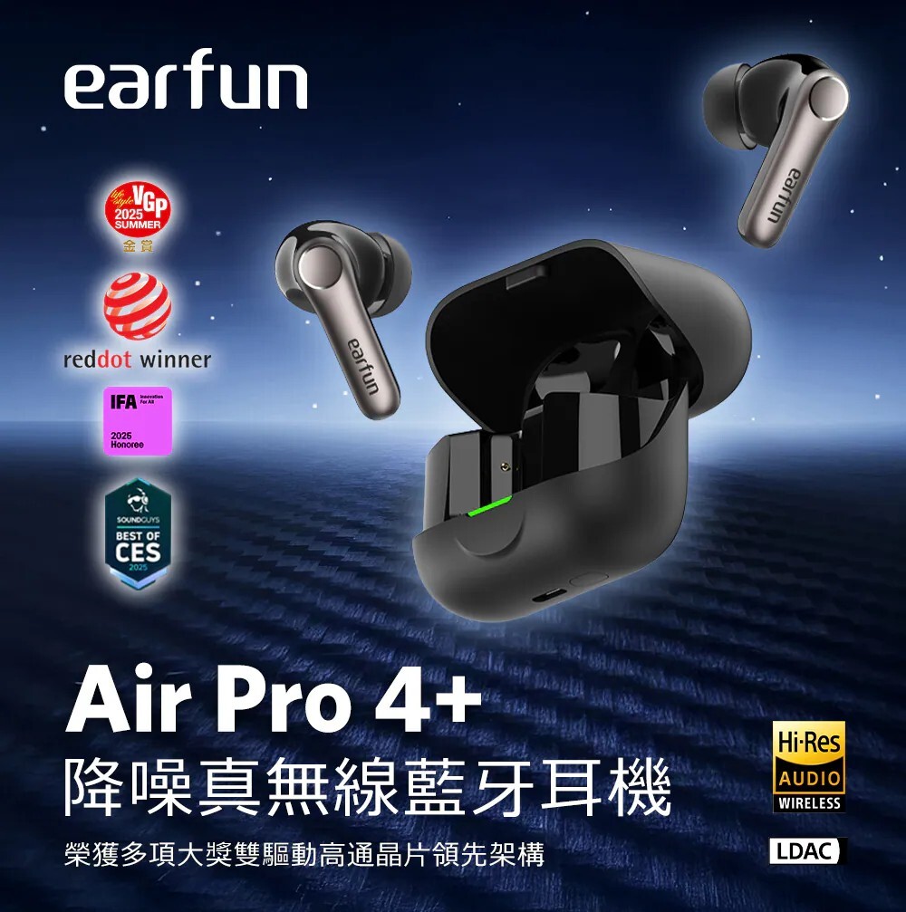 獲獎殊榮|榮獲2025日本VGP金賞肯定 國際肯定|榮獲2025德國紅點設計獎 口碑之選|榮獲2025IFA、CES最佳產品 雙驅共鳴|超輕量動鐵+10mm 動圈單體 聲學革新|領先的微型側邊安裝設計,聲透如晶 串流分享|全新Auracast廣播音訊技術共享收聽 高通驍龍|Snapdragon 最新音頻連線技術 高通編碼|aptX Adaptive 自動調整編碼高穩定度 高通無損|aptX Lossless 24位元/96kHz音訊 高通晶片|採用高通最新 QCC3091晶片 高清編碼|通過 LDAC 高效傳輸,原音重現 白金音質|日本音訊協會 Hi-Res Wireless 認證 革新技術|次世代LE Audio技術與LC3音頻解碼 最新規格|藍牙6.0,超低功耗、穩定傳輸 頂級降噪|QuietSmart 3.0 自適應降噪高達 50dB 通話降噪|AI演算+升級版6麥克風陣列+cVc 8.0技術 遊戲模式|<50ms極低延遲絕,絕佳體驗 長效續航|單次電量12小時,搭充電盒可達54小時 快速充電|快充10分鐘可使用3小時支援無線充電 防塵防水|IP55認證,下雨流汗不困擾 離耳偵測|離耳自動暫停,重新戴上再次播放 多點連線|任意兩個設備無縫自由切換 快速配對|Google Fast Pair連線更有效率 個性控制|EarFun App客製化個人聆聽喜好 AI翻譯| 支援超過100+語言,跨語言溝通更輕鬆 ![]()