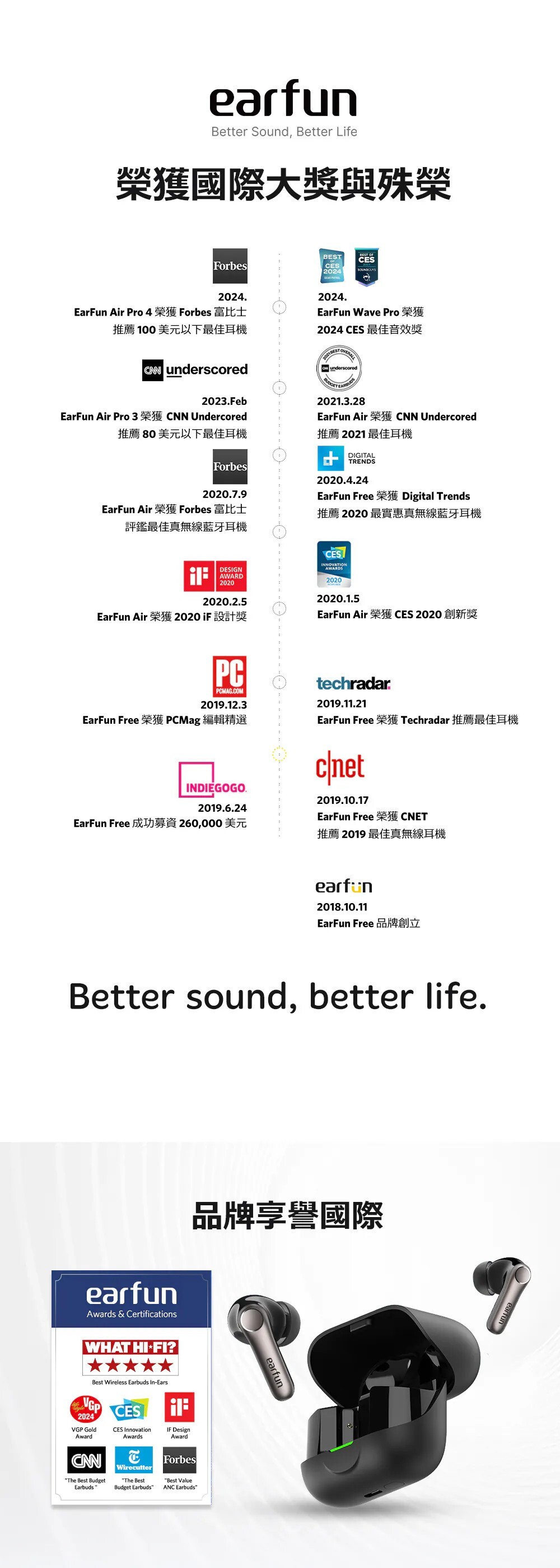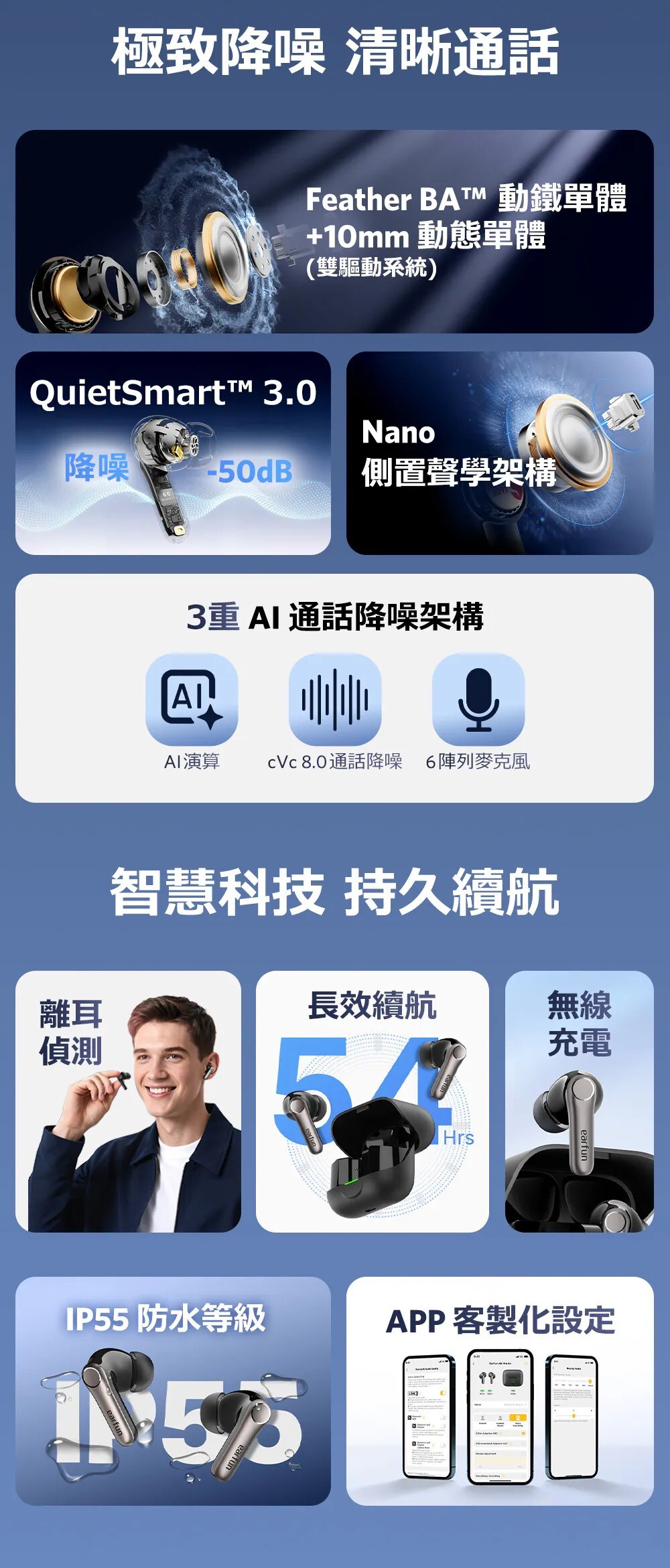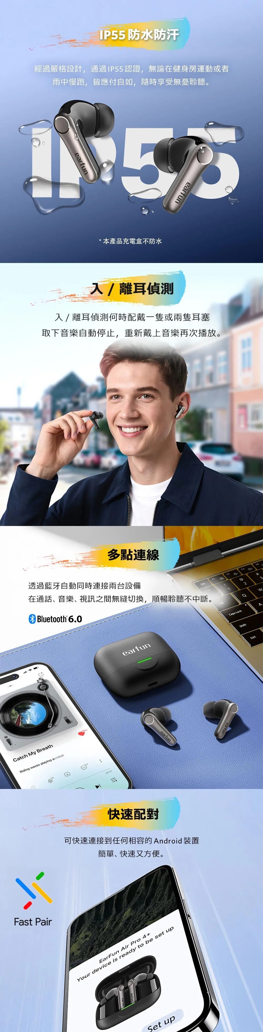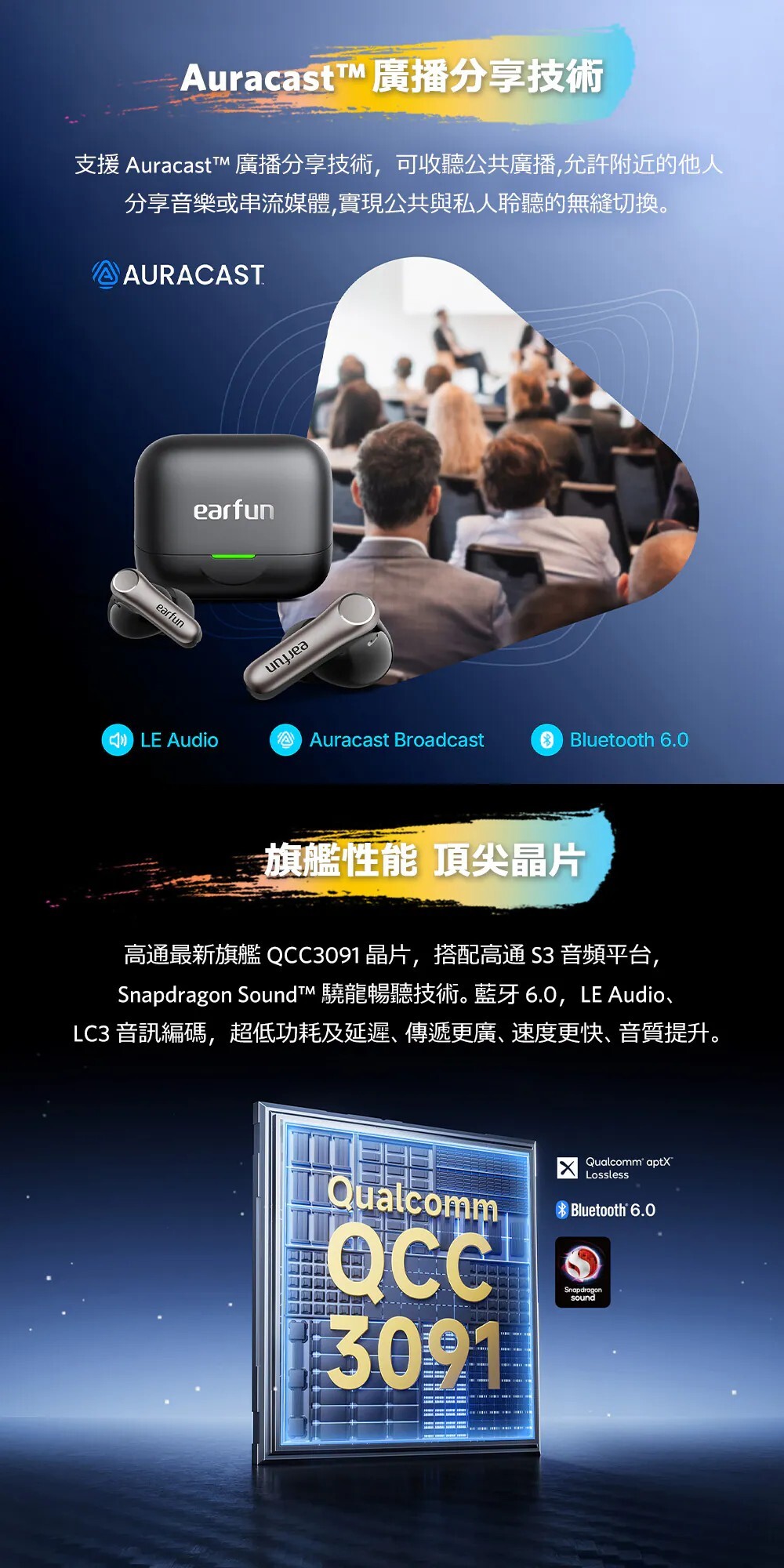 獲獎殊榮|榮獲2025日本VGP金賞肯定 國際肯定|榮獲2025德國紅點設計獎 口碑之選|榮獲2025IFA、CES最佳產品 雙驅共鳴|超輕量動鐵+10mm 動圈單體 聲學革新|領先的微型側邊安裝設計,聲透如晶 串流分享|全新Auracast廣播音訊技術共享收聽 高通驍龍|Snapdragon 最新音頻連線技術 高通編碼|aptX Adaptive 自動調整編碼高穩定度 高通無損|aptX Lossless 24位元/96kHz音訊 高通晶片|採用高通最新 QCC3091晶片 高清編碼|通過 LDAC 高效傳輸,原音重現 白金音質|日本音訊協會 Hi-Res Wireless 認證 革新技術|次世代LE Audio技術與LC3音頻解碼 最新規格|藍牙6.0,超低功耗、穩定傳輸 頂級降噪|QuietSmart 3.0 自適應降噪高達 50dB 通話降噪|AI演算+升級版6麥克風陣列+cVc 8.0技術 遊戲模式|<50ms極低延遲絕,絕佳體驗 長效續航|單次電量12小時,搭充電盒可達54小時 快速充電|快充10分鐘可使用3小時支援無線充電 防塵防水|IP55認證,下雨流汗不困擾 離耳偵測|離耳自動暫停,重新戴上再次播放 多點連線|任意兩個設備無縫自由切換 快速配對|Google Fast Pair連線更有效率 個性控制|EarFun App客製化個人聆聽喜好 AI翻譯| 支援超過100+語言,跨語言溝通更輕鬆 ![]()