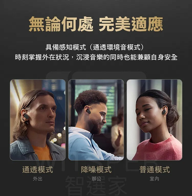 ● 隨時隨地 掌握外界|支援感知模式(通透環境音模式),時刻掌握外在狀況、聲響,沉浸音樂的同時也能兼顧自身安全