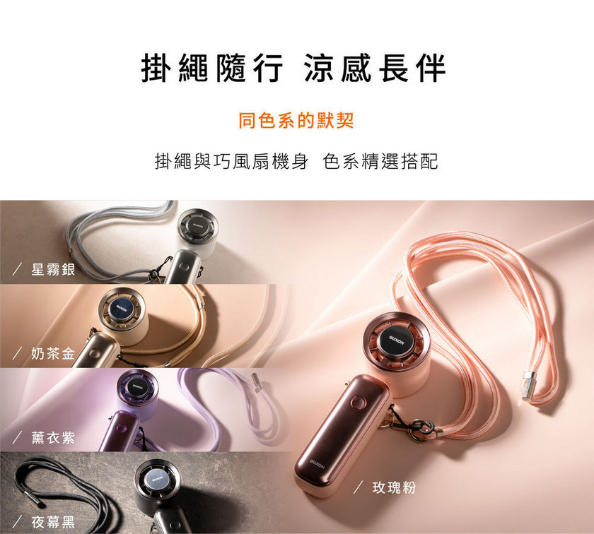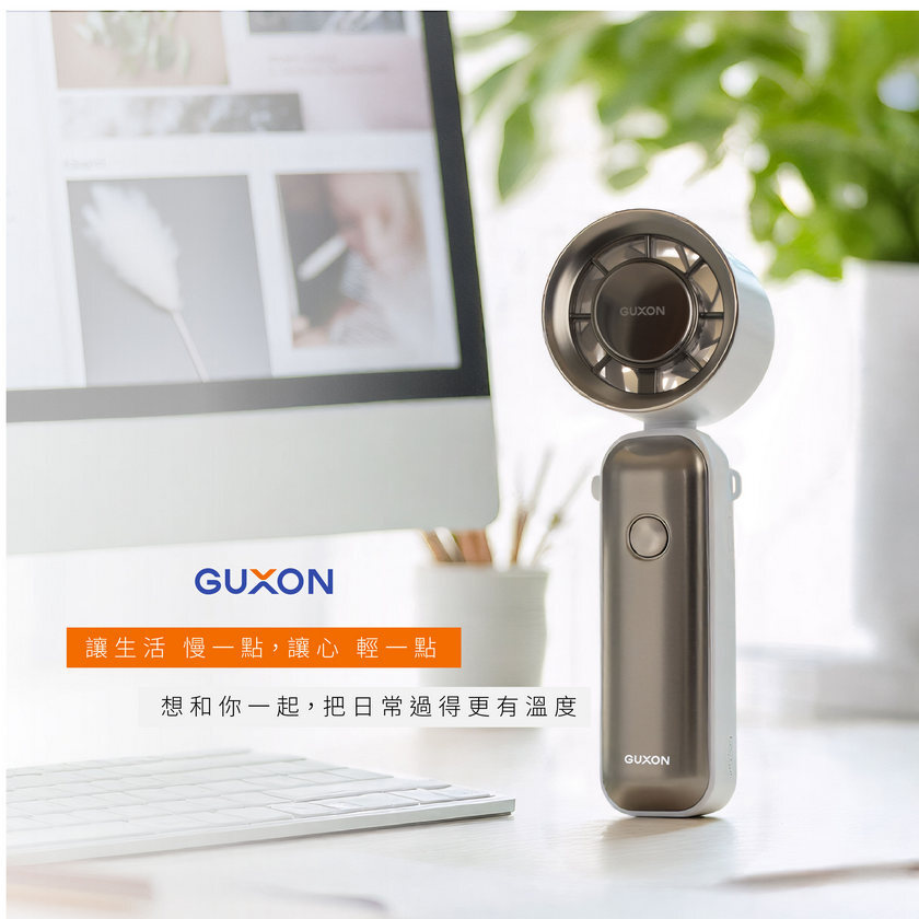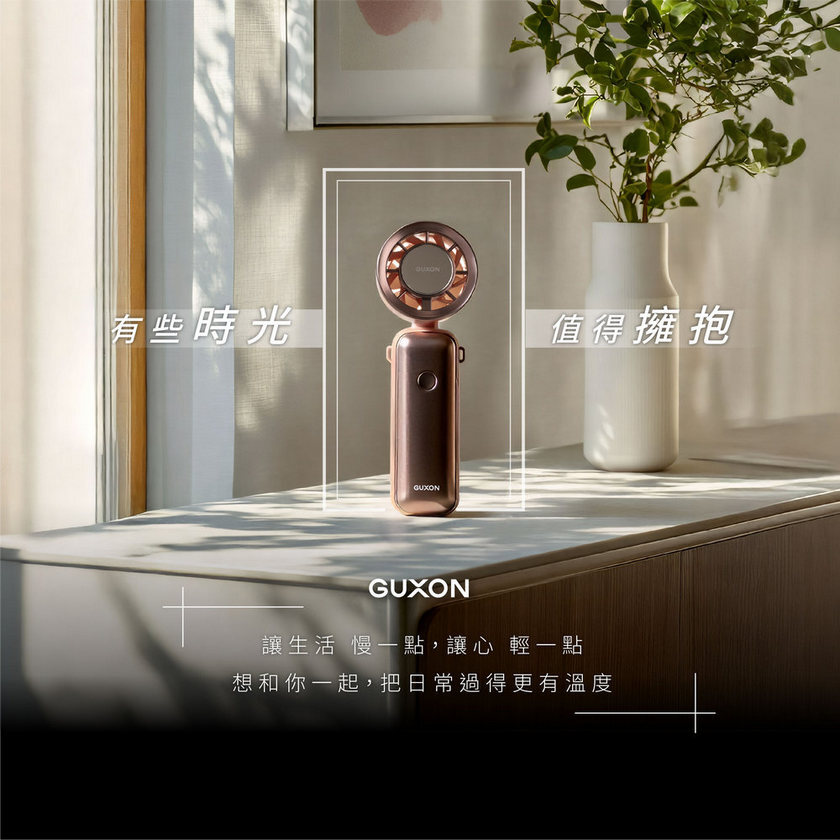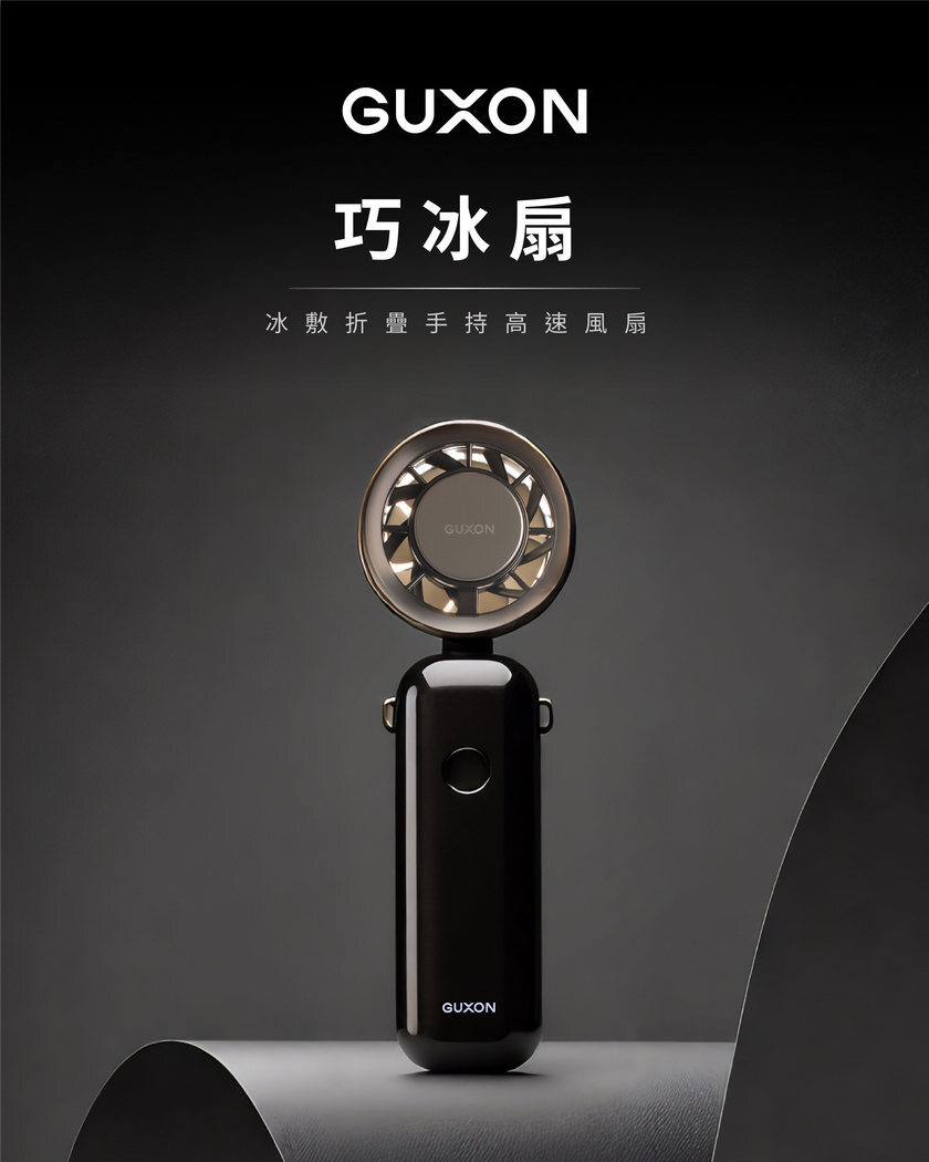 GUXON 巧冰扇,結合「五段風速+製冷片」雙涼感技術,隨身手持、掛脖、桌立三用設計,輕巧收折不卡包,露營、登山、通勤一路涼爽同行。