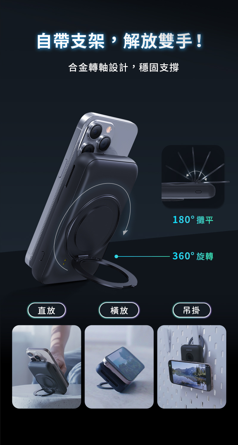 ⚡️ 三合一設計|集行動電源、無線充座、手機支架於一體