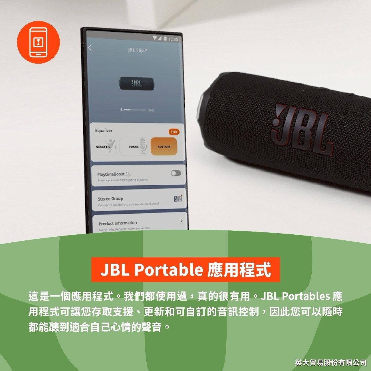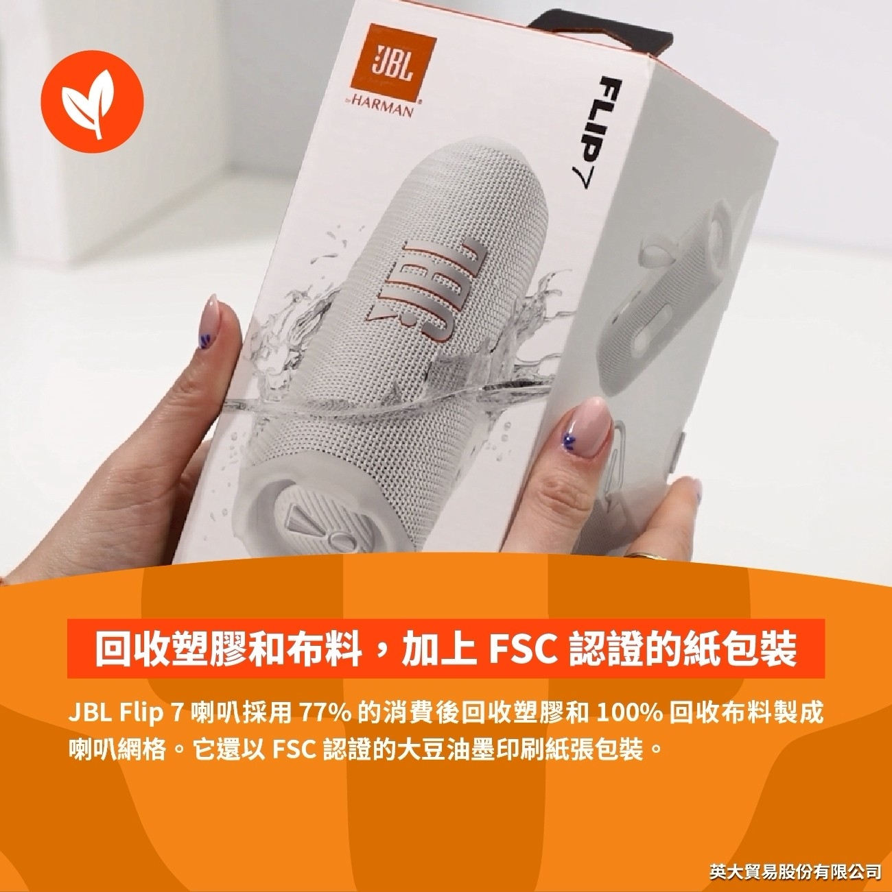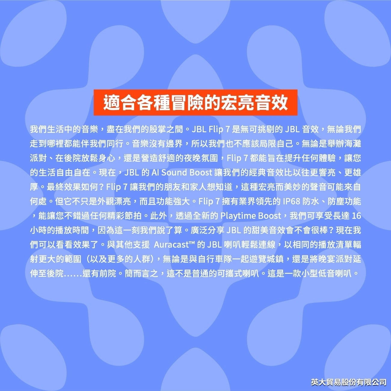 JBL Flip 7 有無可挑剔的 JBL 音效,無論我們走到哪裡都能伴我們同行。無論是舉辦海灘派對、在後院放鬆身心,還是營造舒適的夜晚氛圍,Flip 7 都能提升體驗,讓您的生活自由自在。JBL 的 AI Sound Boost 讓經典音效比以往更響亮、更雄厚。它不只是外觀漂亮,而且功能強大。Flip 7 擁有業界領先的 IP68 防水、防塵功能,能讓您不錯過任何精彩節拍。此外,透過全新的 Playtime Boost,我們可享受長達 16 小時的播放時間。JBL Flip 7 有Auracast功能,可以和其他同樣擁有 Auracast 功能的喇叭連接播放。