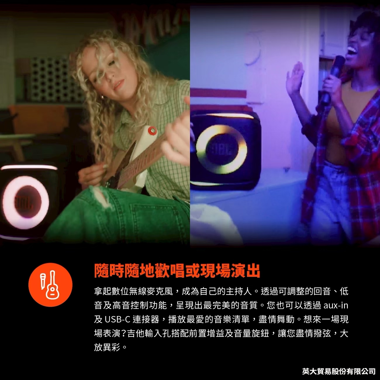 支援麥克風、吉他、AUX 與 USB-C 輸入