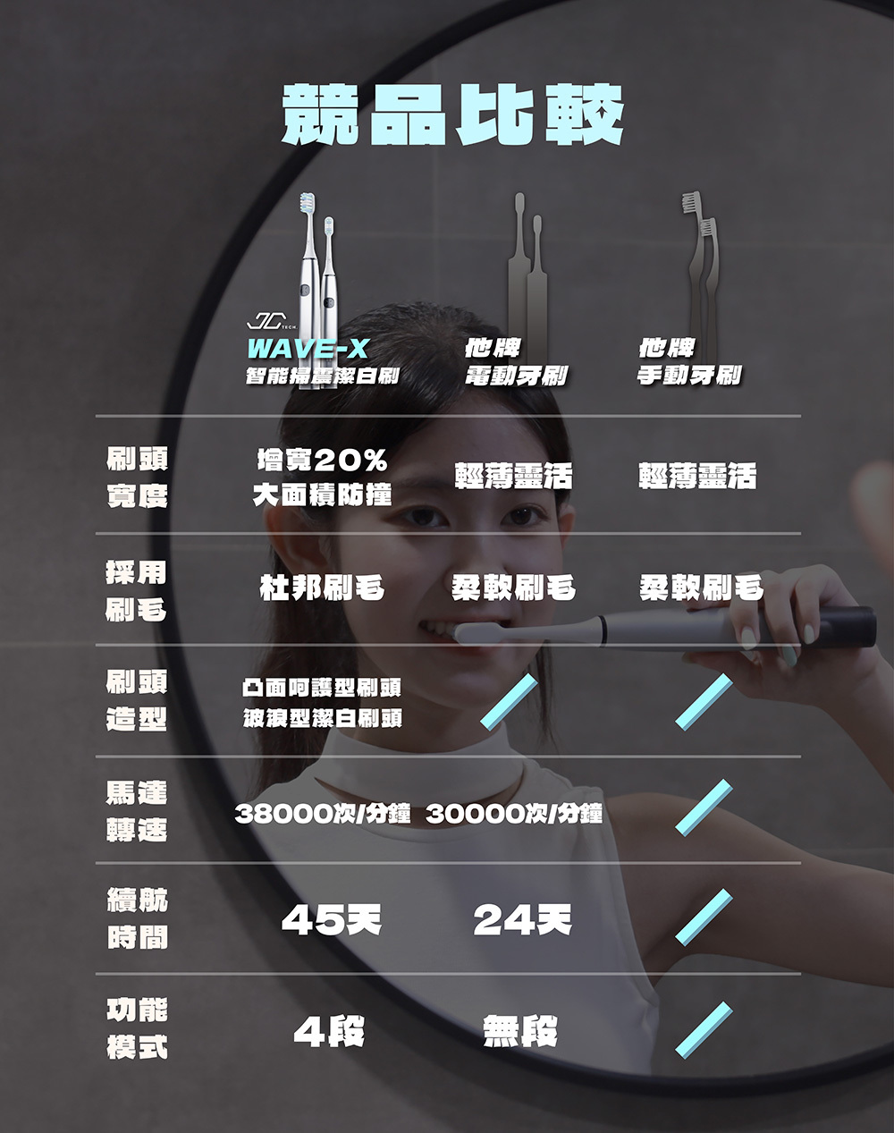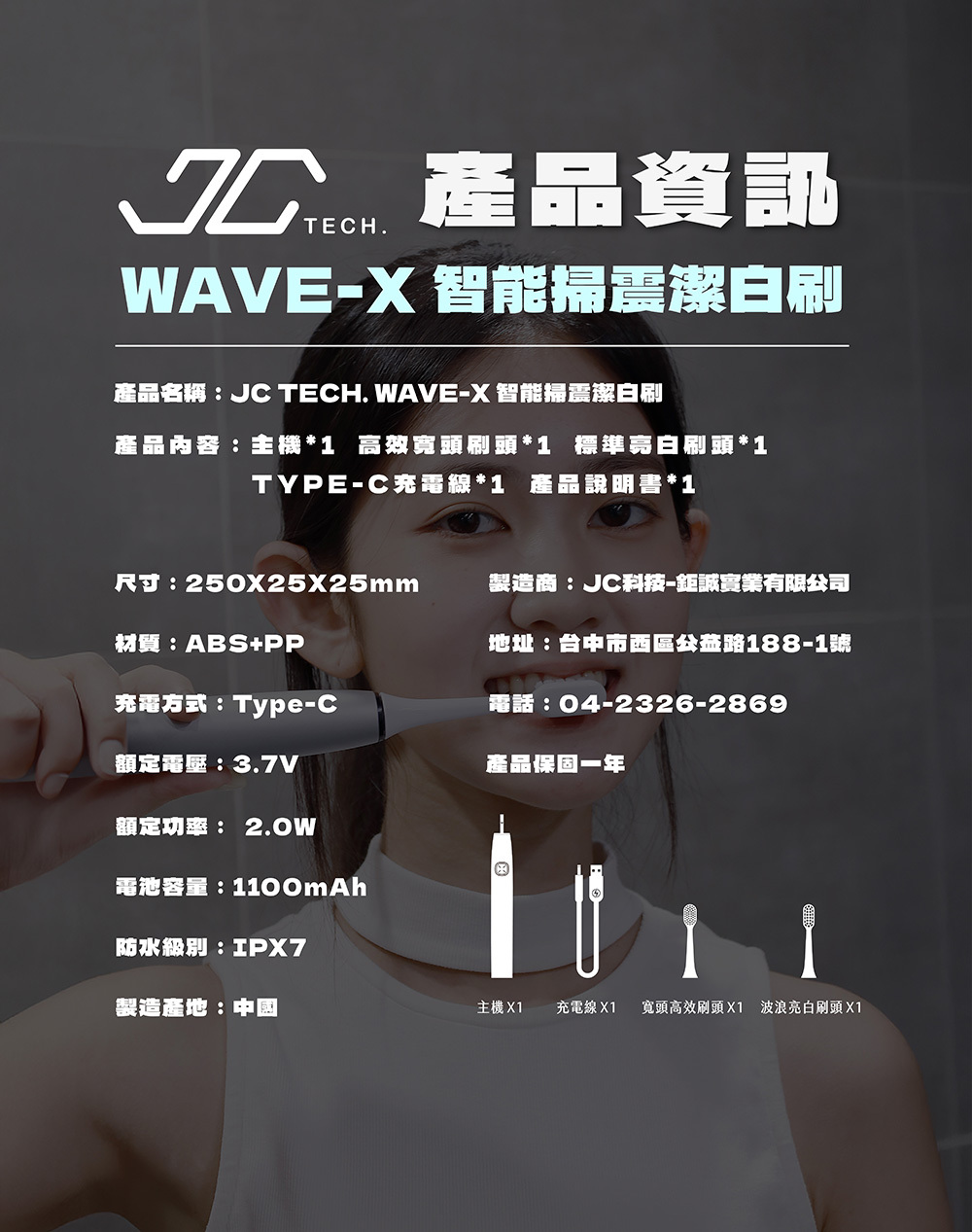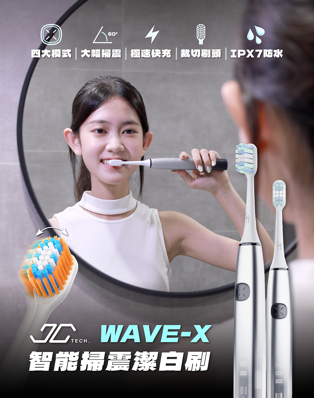 全新【JC TECH.】WAVE-X 智能掃震潔白刷,融合實驗室研究與AI精算,為你帶來更有效率、更舒適的潔牙新體驗。