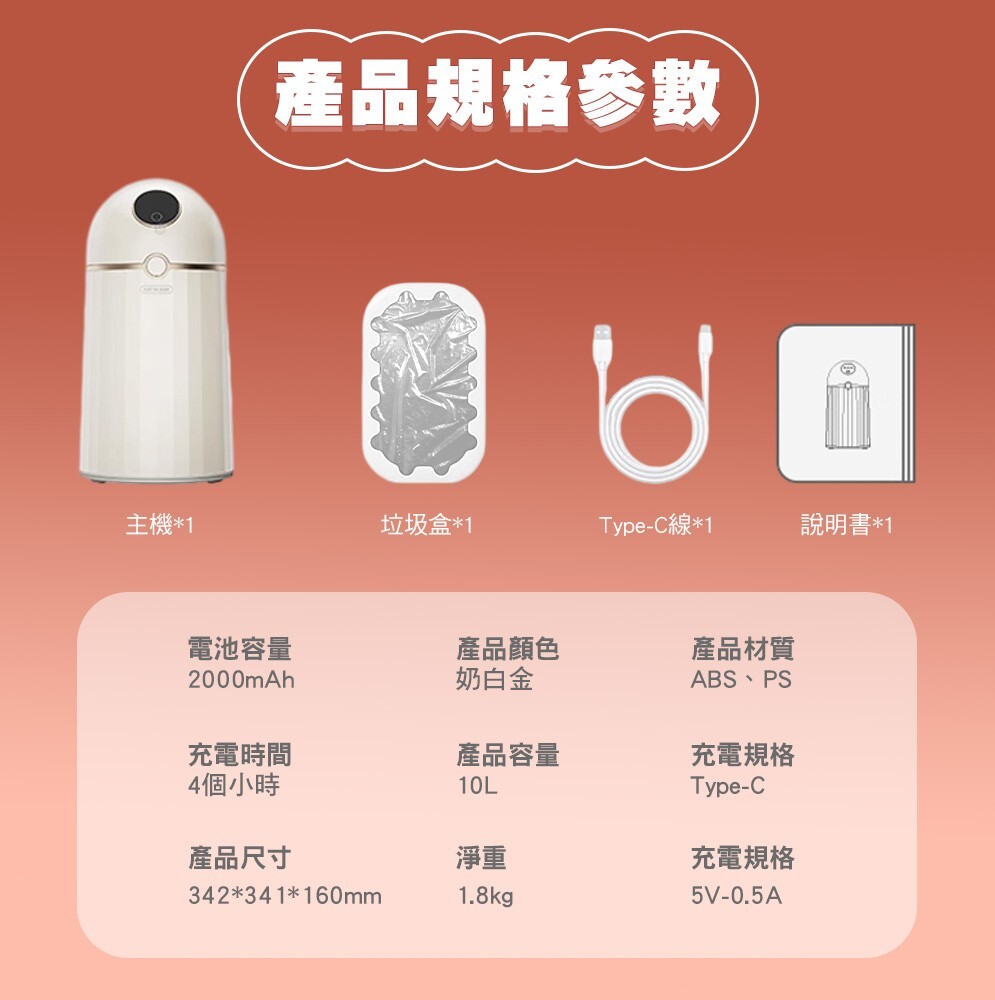內容物:主機*1、Type-c線*1、垃圾盒*1、說明書*1
