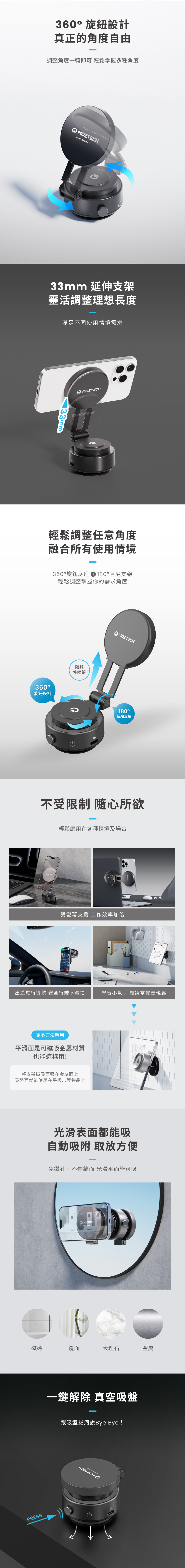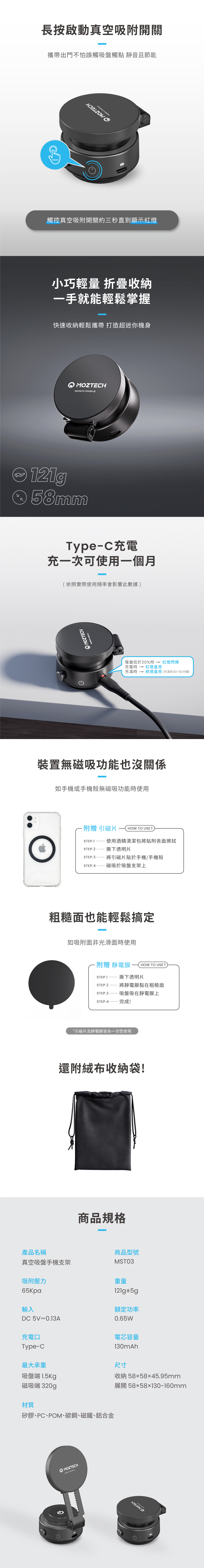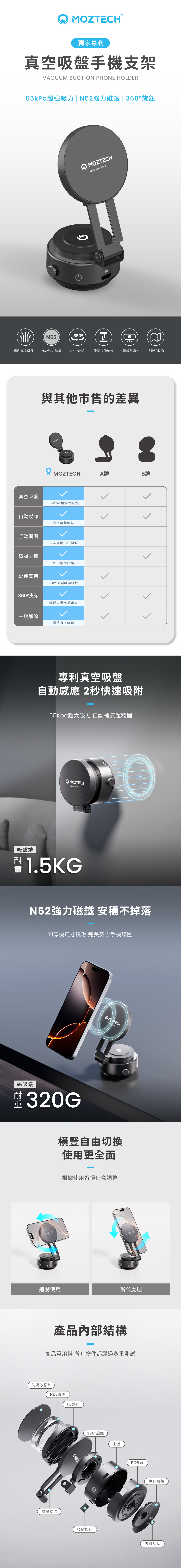 ▪ 專利真空吸盤 - 65kpa超強大吸力 自動補氣 超穩固