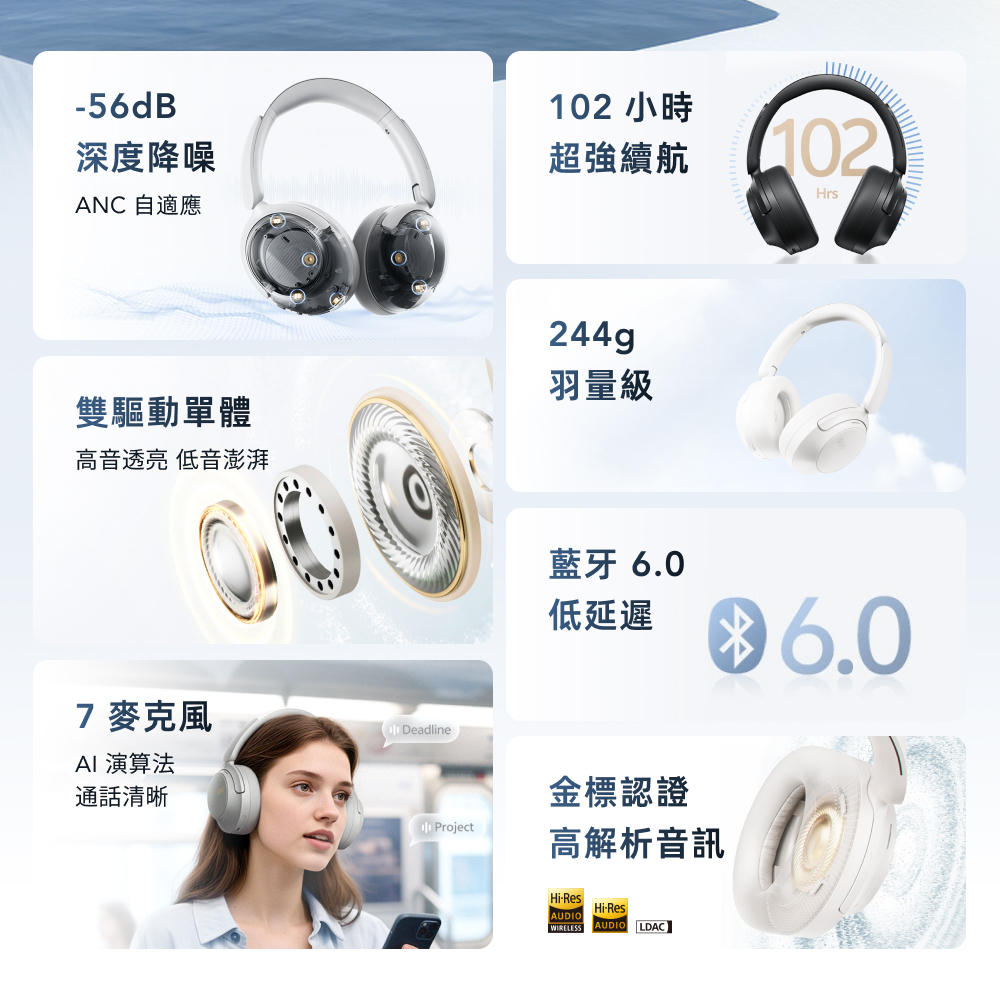 🎧 輕盈配戴|約 244g 重量,久戴更舒適