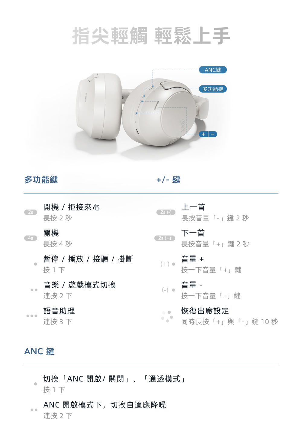 續航時間:ANC 開啟最長 58 小時;ANC 關閉最長 102 小時