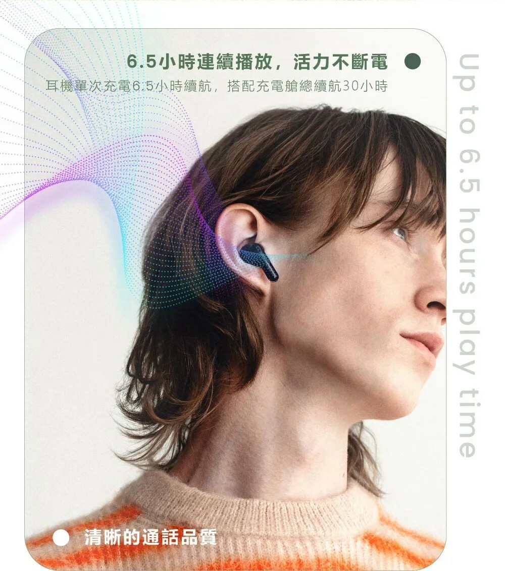 ● 播放時間 : 6.5小時,搭配充電艙總續航30小時