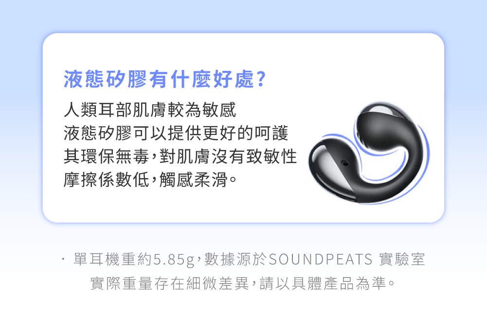 • 採用液態矽膠+高韌性記憶鋼絲,服貼耳型、不易脫落、不傷頭髮