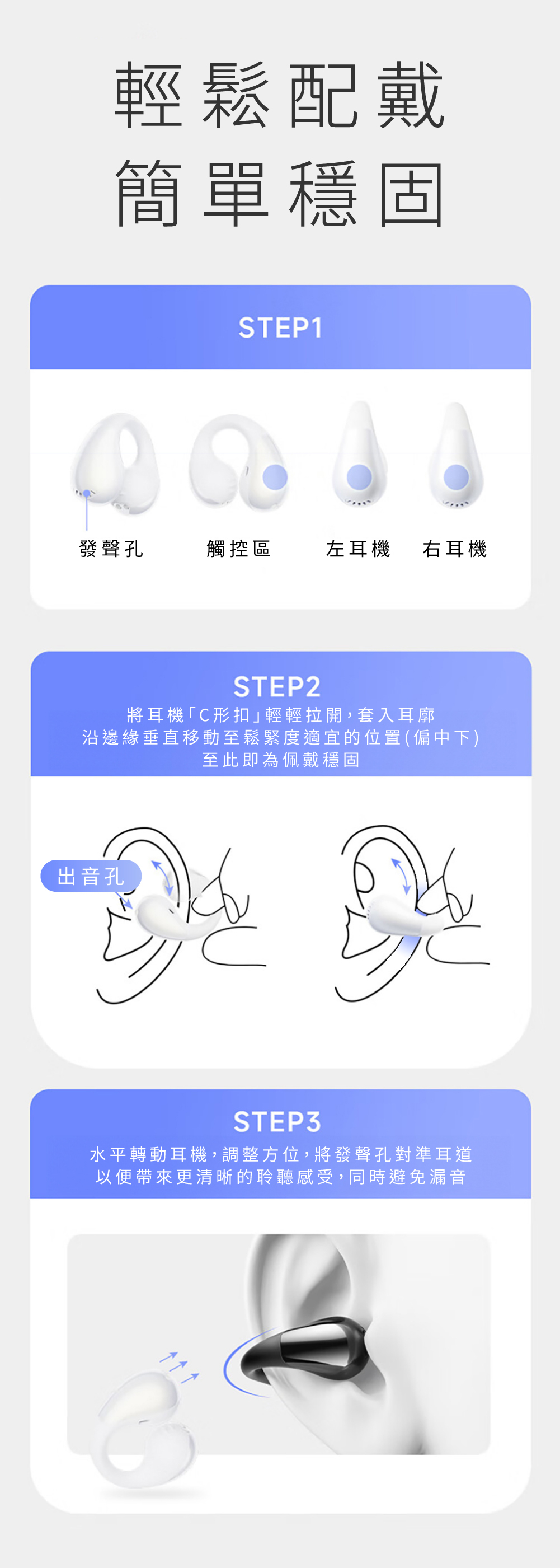 • 耳夾式設計,不入耳也不漏音,0壓迫感更衛生!