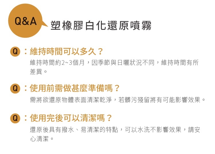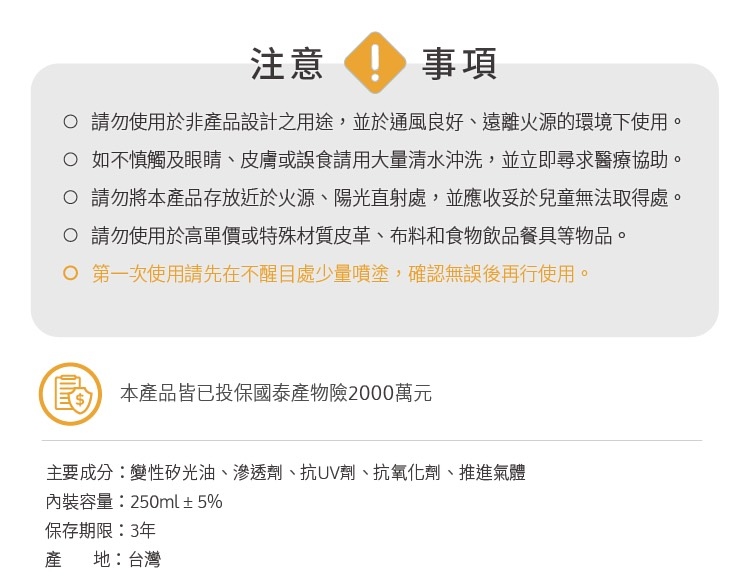 .為避某些特殊素材於使用後可能輕微變色,第一次使用請先在不顯目處少量              噴塗,確認無誤後再行使用。