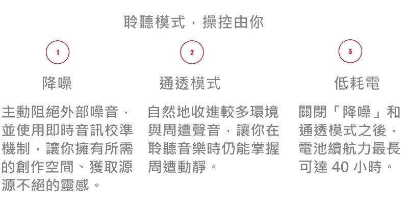 我們知道,你唯一不可或缺的就是音樂。通透模式會以自然的方式收入更多環境與周遭的噪音,同時保有令人驚豔的播放音質。
