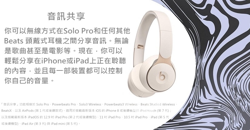 「音訊共享」功能讓你可以無線方式在 Solo Pro 和任何其他 Beats 頭戴式耳機或 AirPods 之間分享音訊。