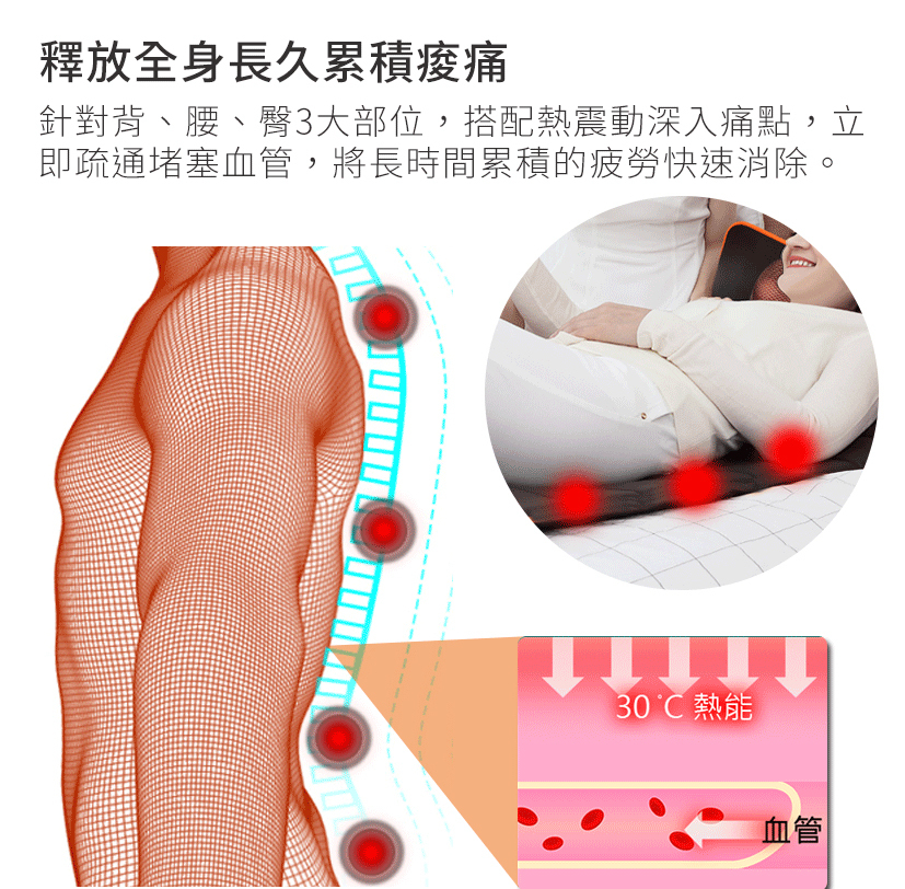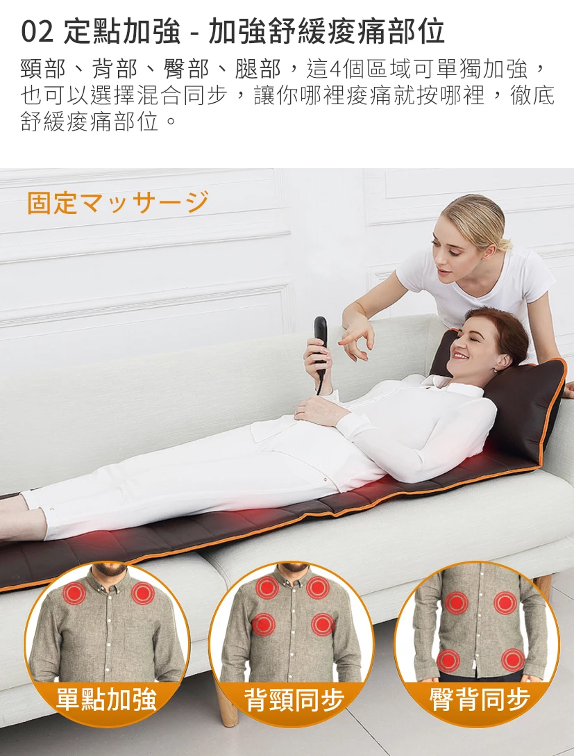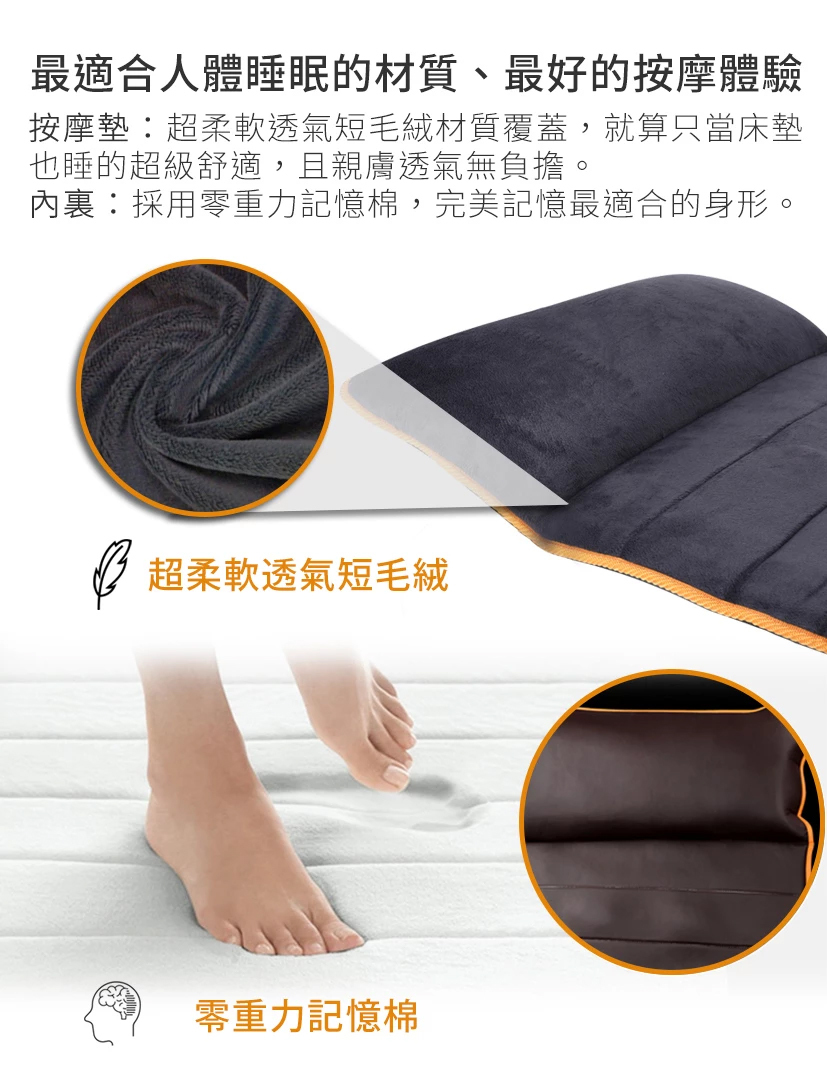 全身定點定位按摩,加強舒緩痠痛部位,首創獨立恆溫式按摩,熱敷舒緩雙重放鬆。超柔軟透氣短毛絨覆蓋,讓你躺在上面就不想起來。