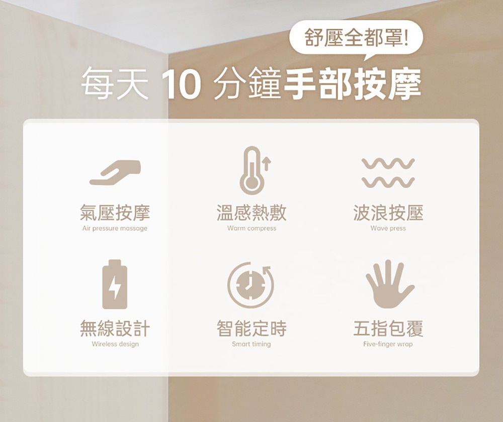 ❶ 五指獨立包覆,夾揉穴位按摩關節