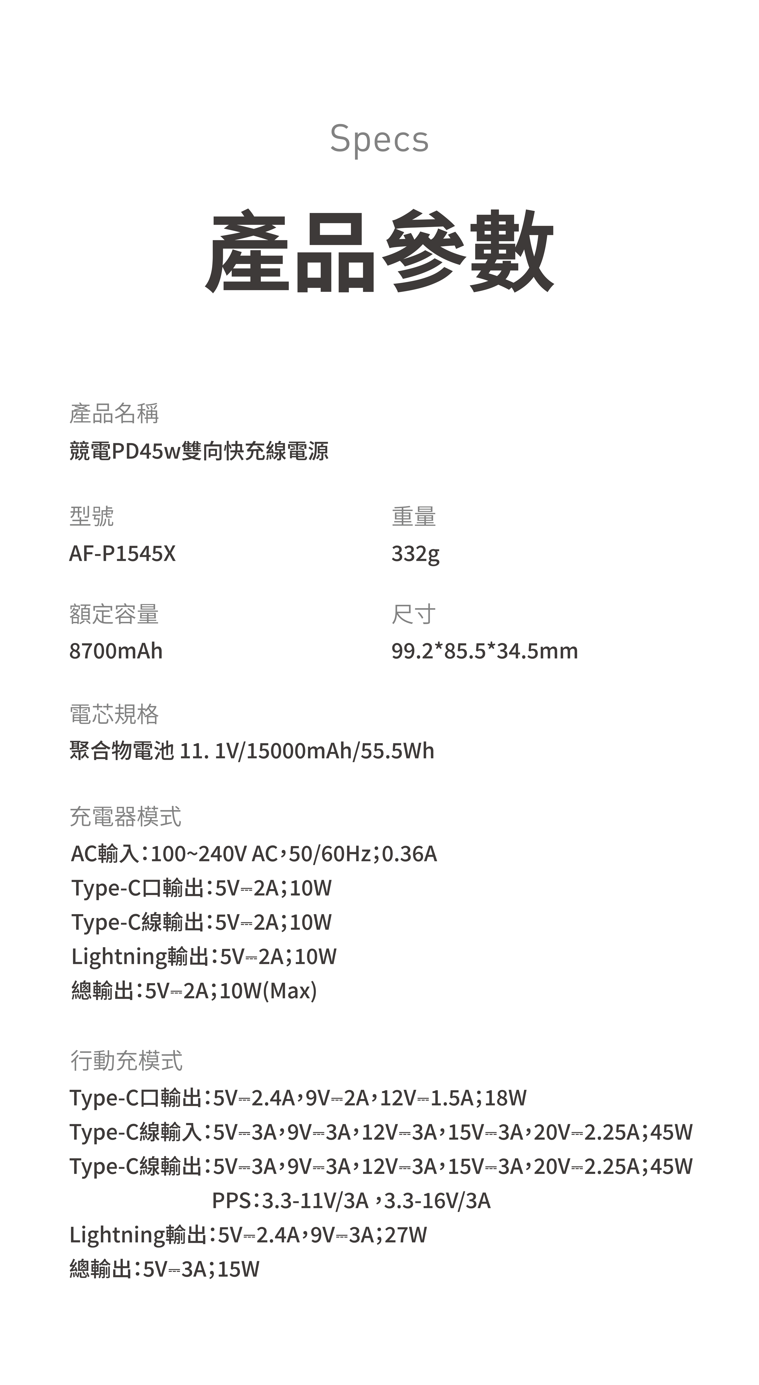 Type-C線輸入:5V-3A/9V-3A/12V-3A/15V-3A/20V-2.25A 45W (Max)