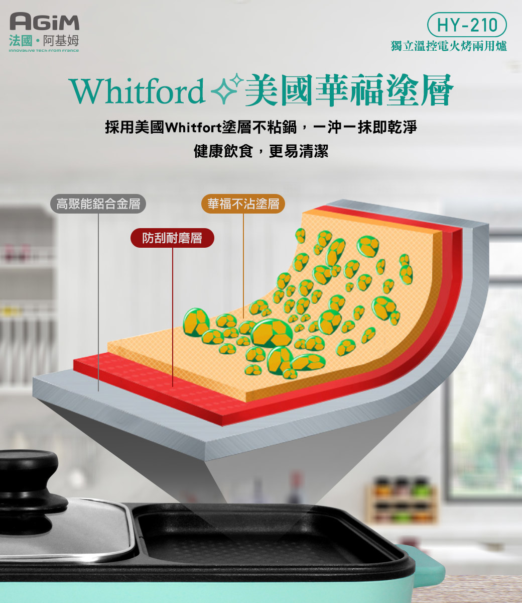 .材質:鋁合金(烤盤)、Whitford(塗層)、鋼化玻璃(鍋蓋)、電木(外殼)