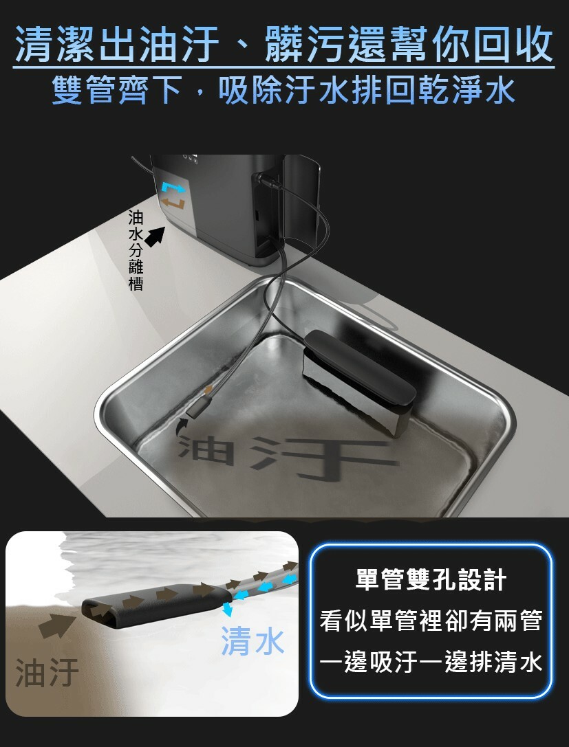 A2:內建油水分離系統,利用油比水輕的特性,搭配分隔槽將油水區隔,能將油汙流在前端,乾淨水透過後端排回水槽。