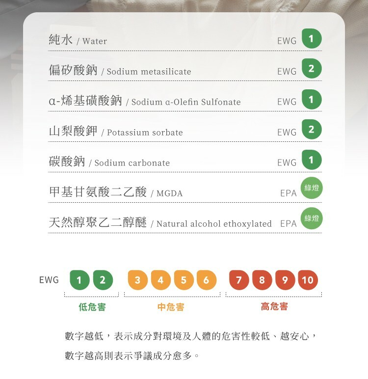 ●主要成分:純水、偏矽酸鈉、 α-烯基磺酸鈉 、山梨酸鉀、碳酸鈉、MGDA、天然醇聚乙二醇醚