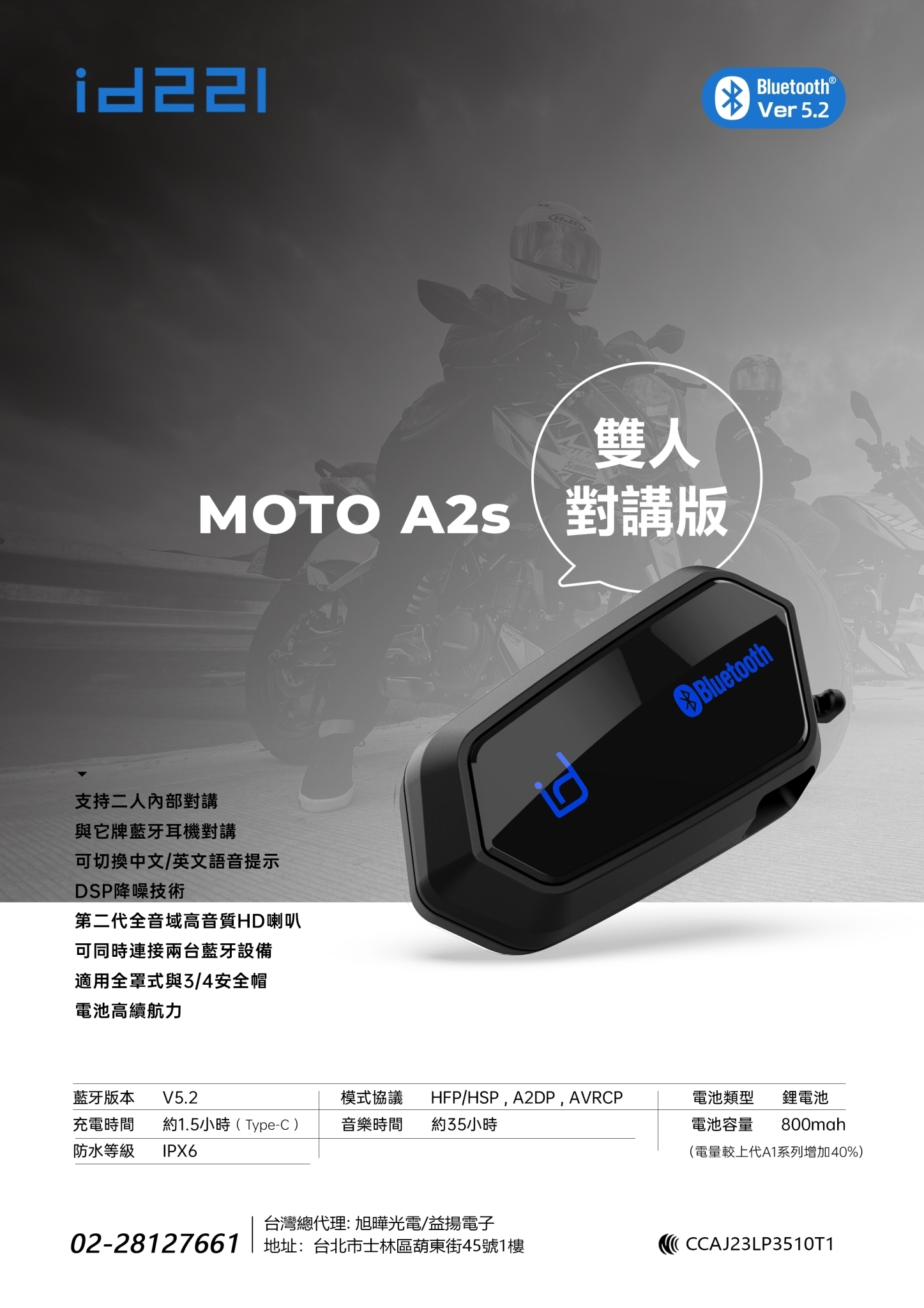 升級雙人對講,最新藍芽 5.2 晶片,id221 MOTO A2S 全新上市!