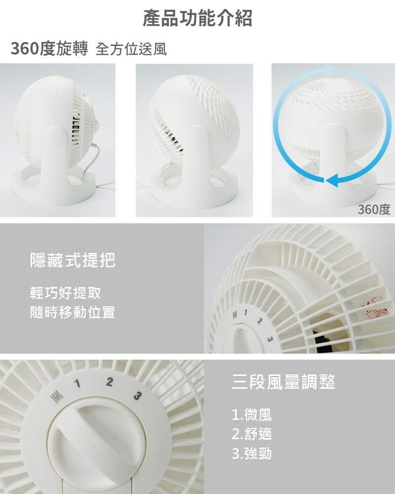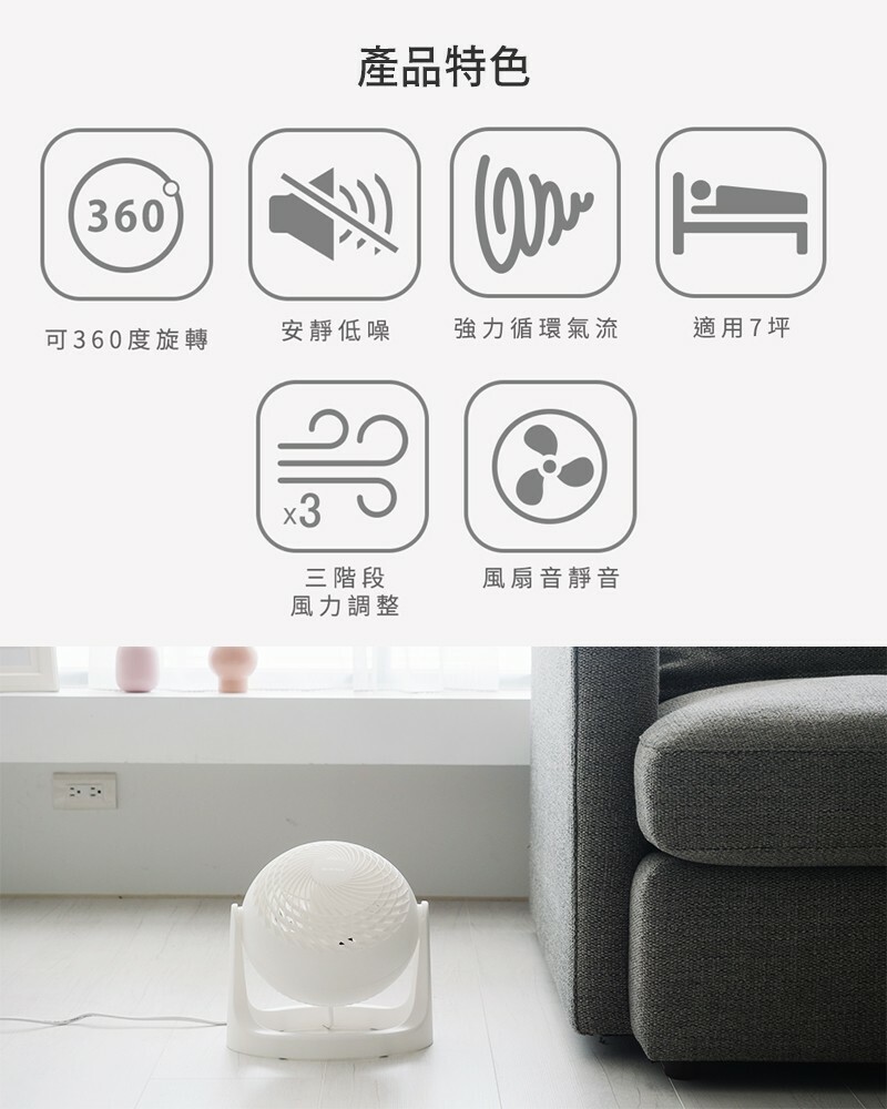 ●可360度調節旋轉,適用7坪空間