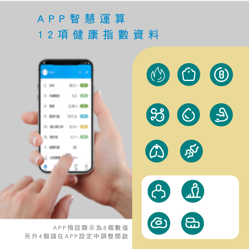 • 12項身體數據健康指數資料,分析身體狀態,輕鬆追蹤,守護健康。