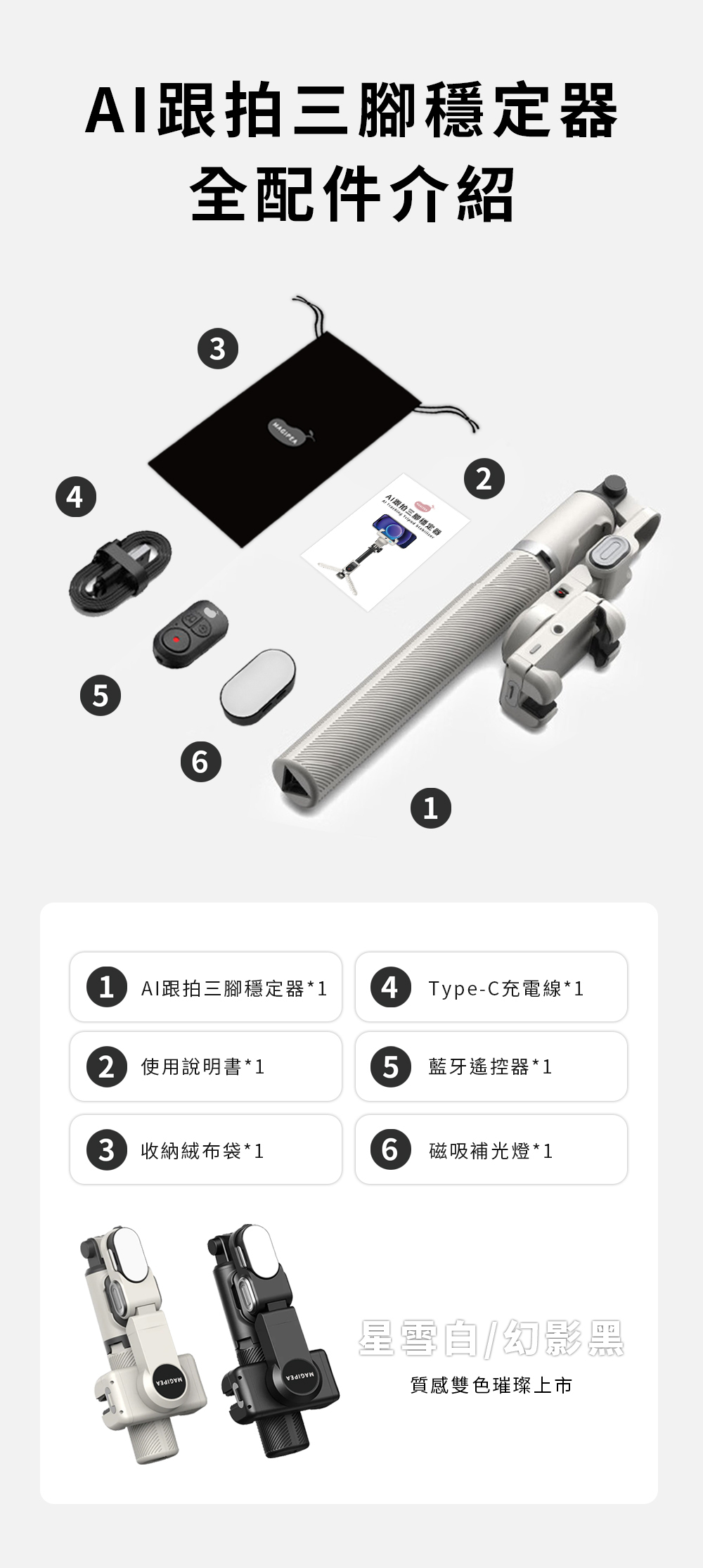 ●內容物:AI跟拍三腳穩定器*1、TYPEC充電線*1、搖控器*1、收納袋*1、磁吸補光燈*1、說明書*1