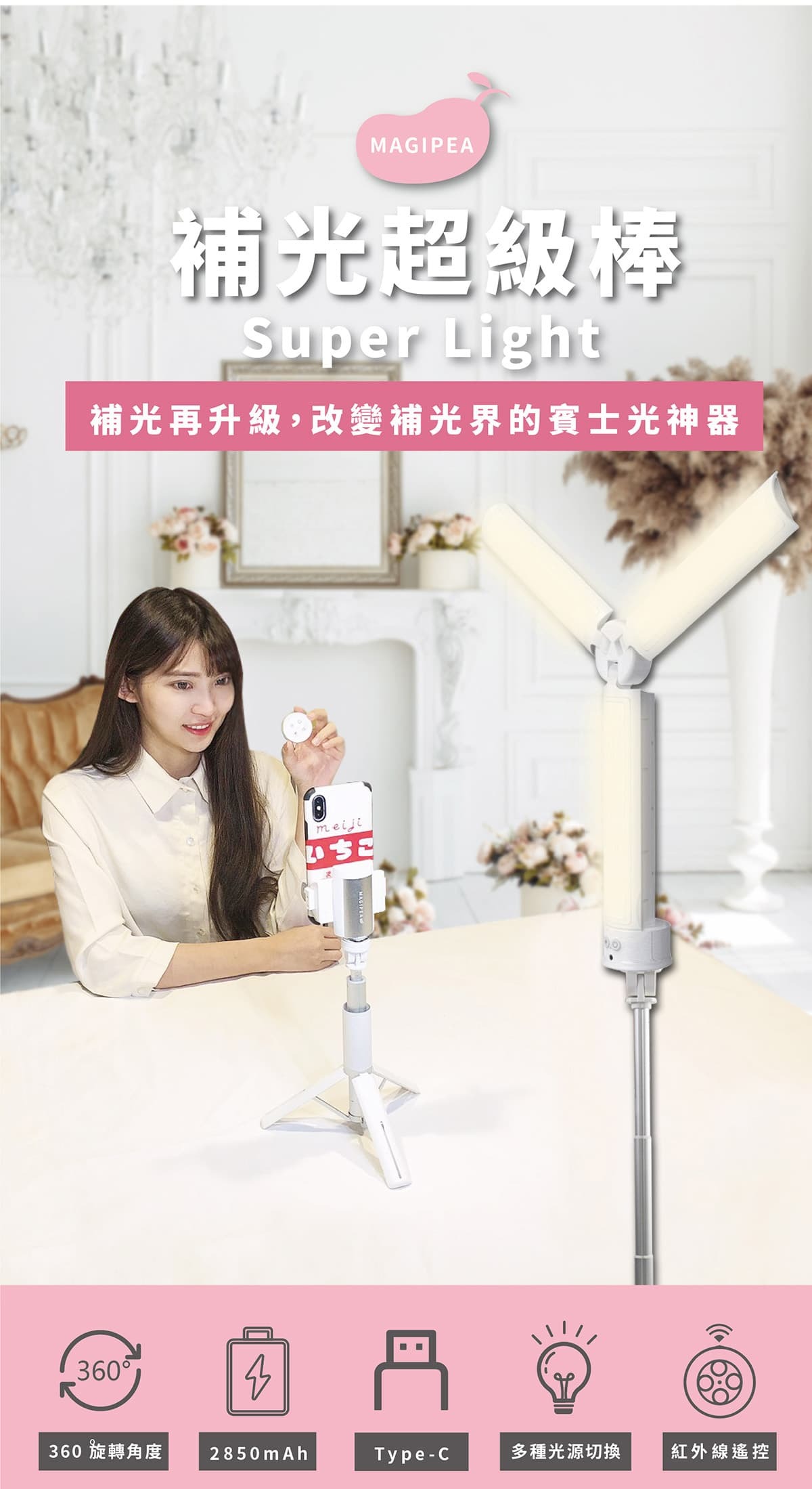 ●內容物:MAGIPEA 美極品補光超級棒、TYPEC充電線、搖控器