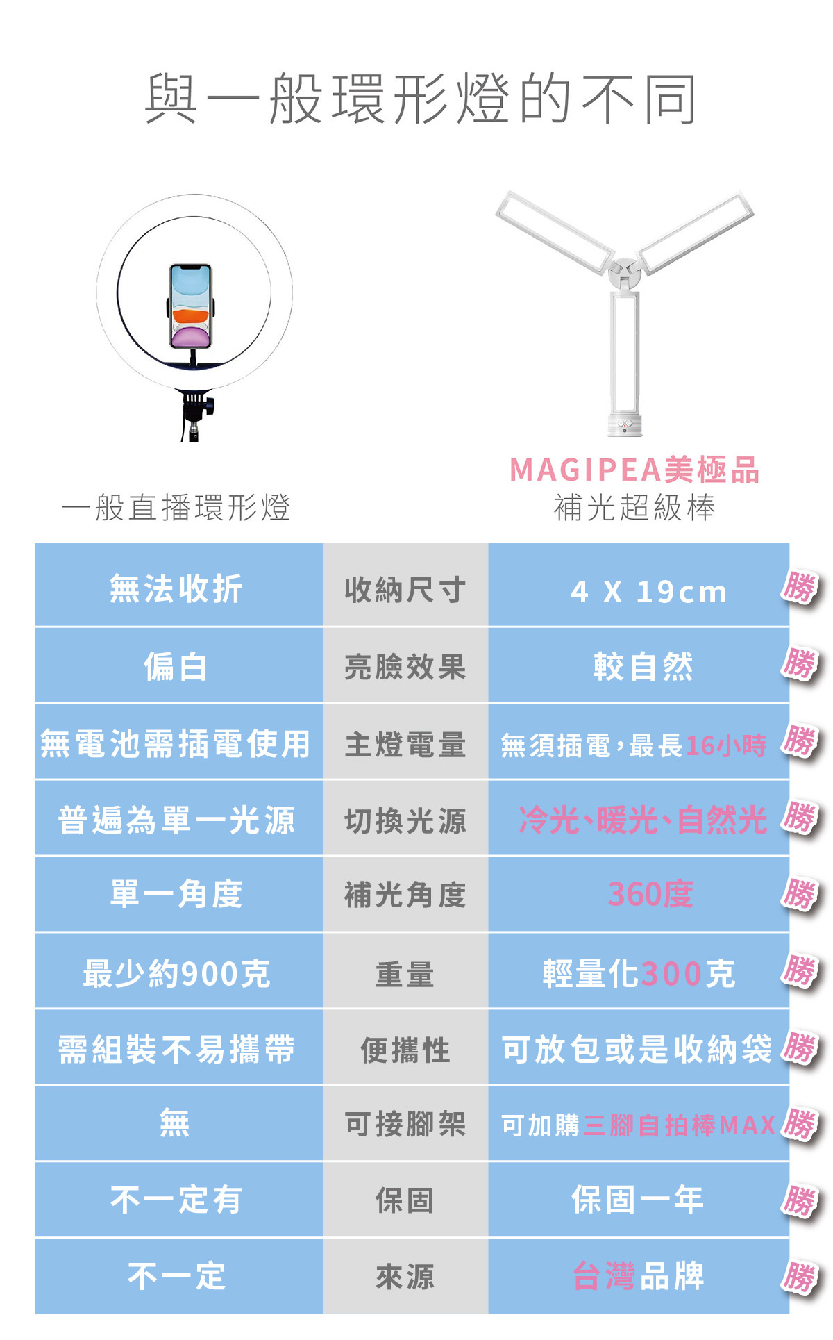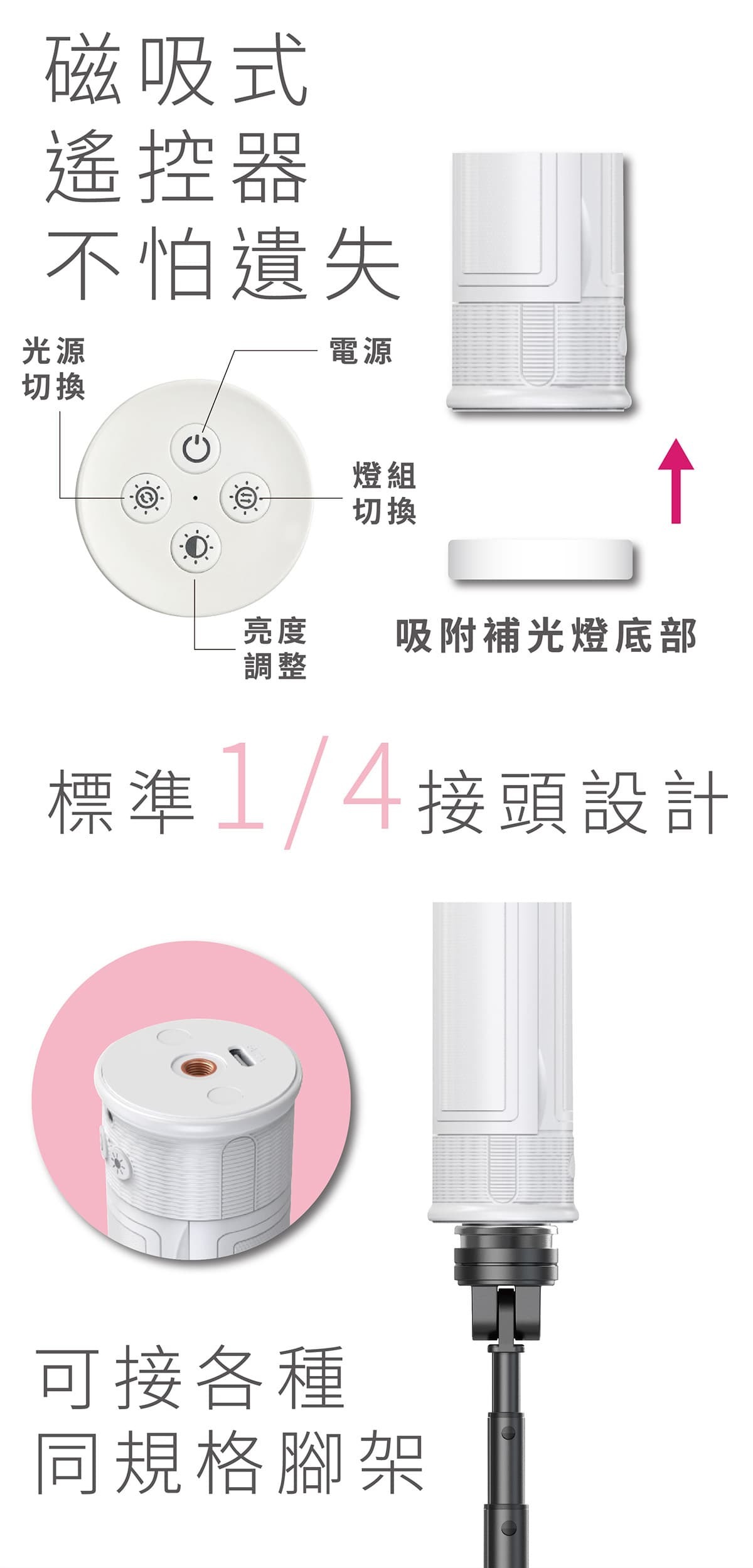 ●三種光源隨時切換,冷光、暖光、自然光 .360度旋轉補光角度