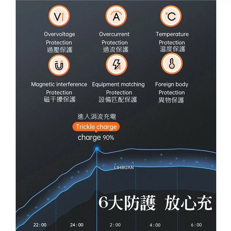●充電狀態一目了然,LED柔和呼吸燈,實時顯示充電狀態和異物檢測,避免高溫或空耗浪費電