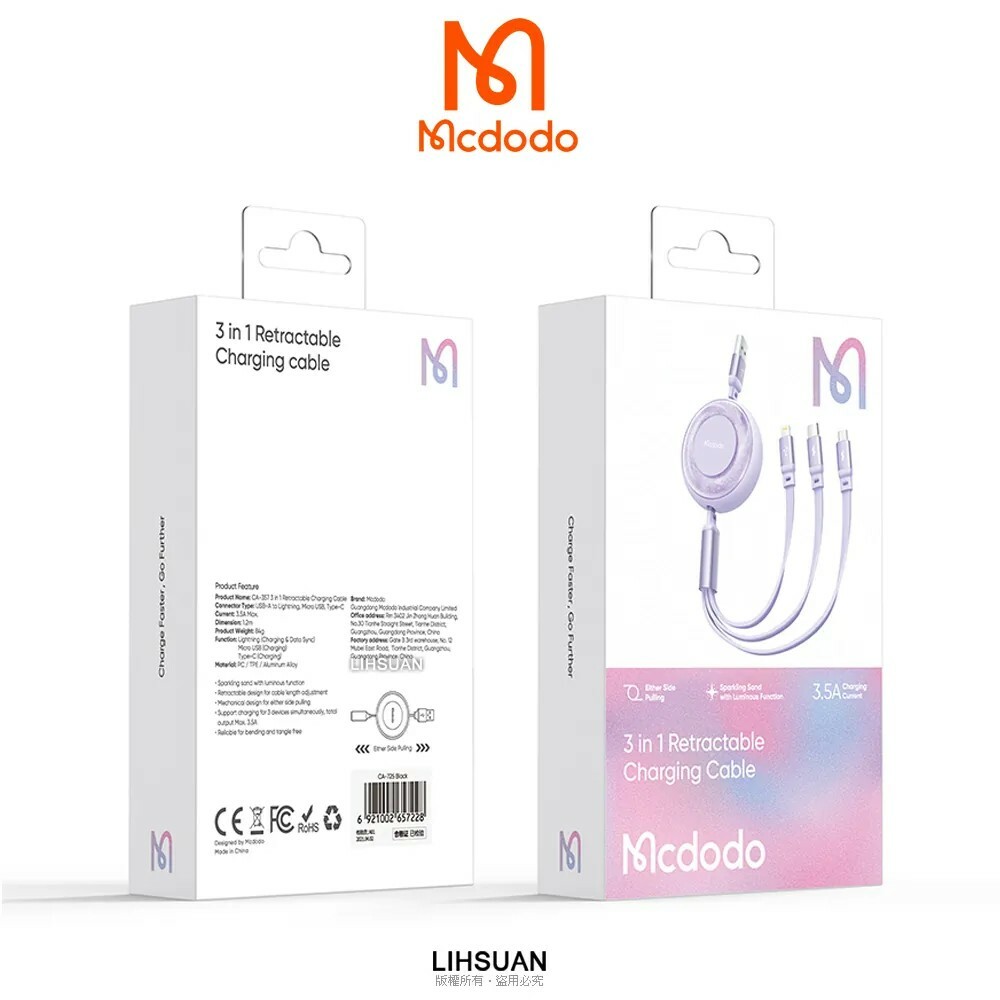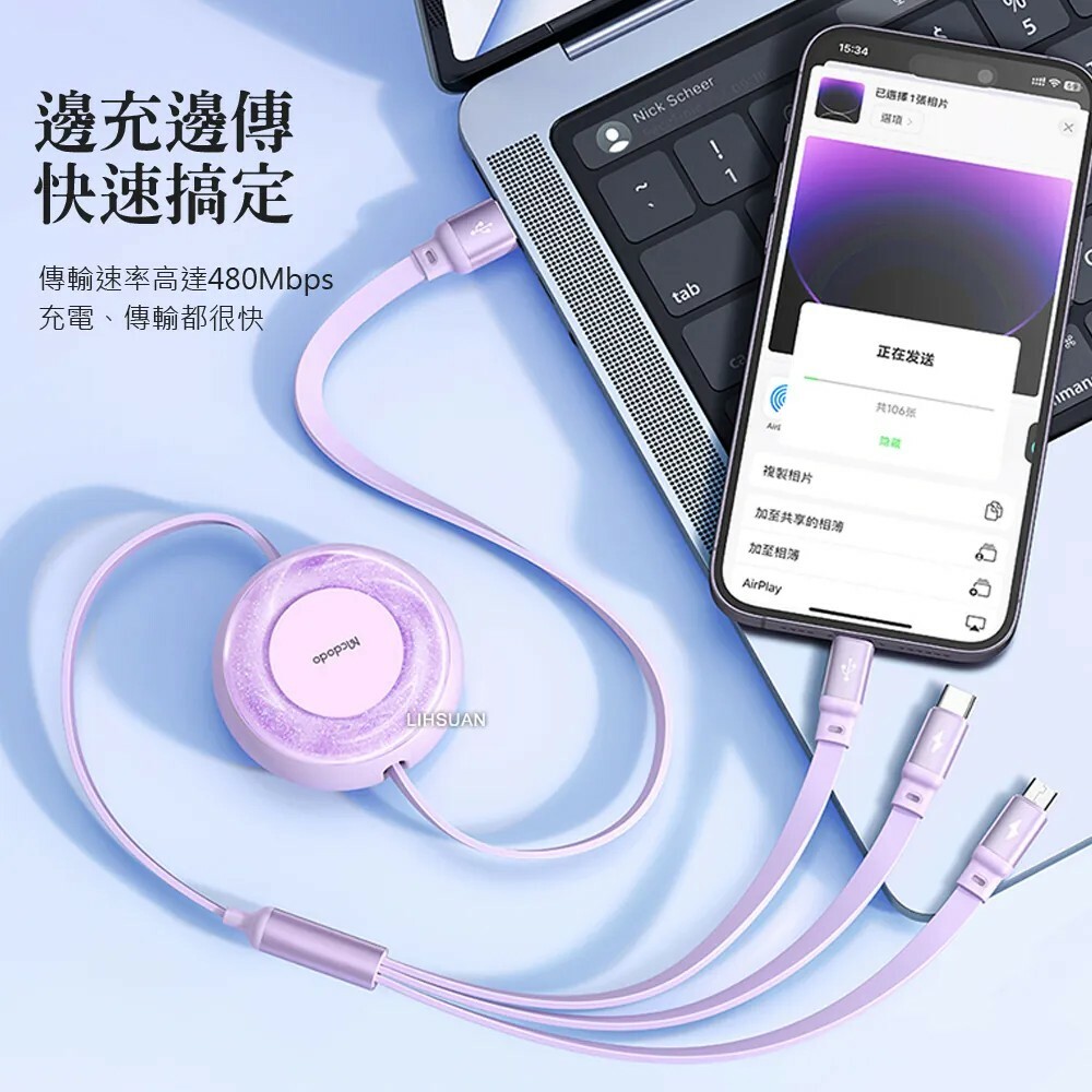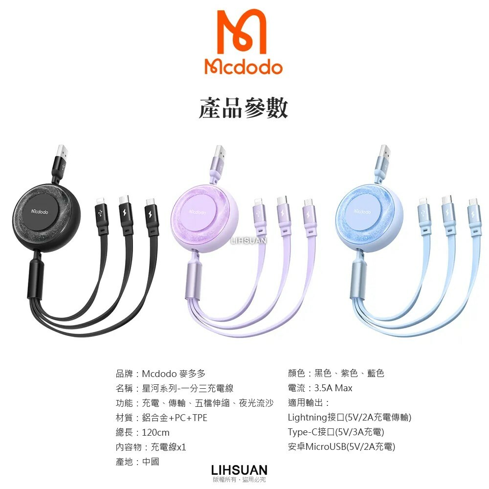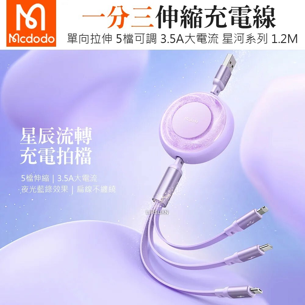 【Mcdodo麥多多】一分三伸縮收納充電線 閃充線 IPhone 充電線 安卓/TypeC適用 星河系列 三色