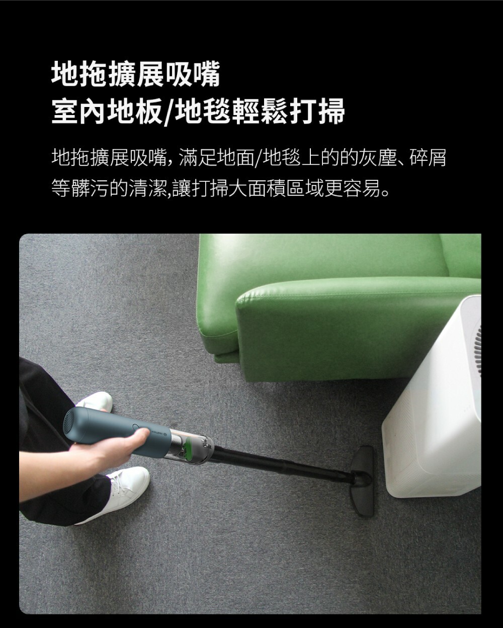 ●配件 : 主機x1、二合一吸頭x1、毛刷吸頭x1、拖地吸頭x1、轉接管x1、窄縫吸頭x1、加長軟管x1、充電線x1