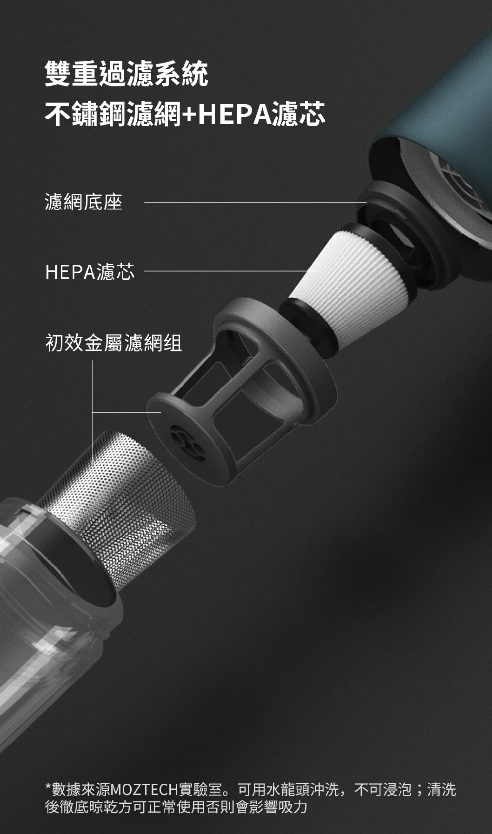 ●雙重過濾-不鏽鋼濾網+HEPA濾芯,兩層過濾超安心。